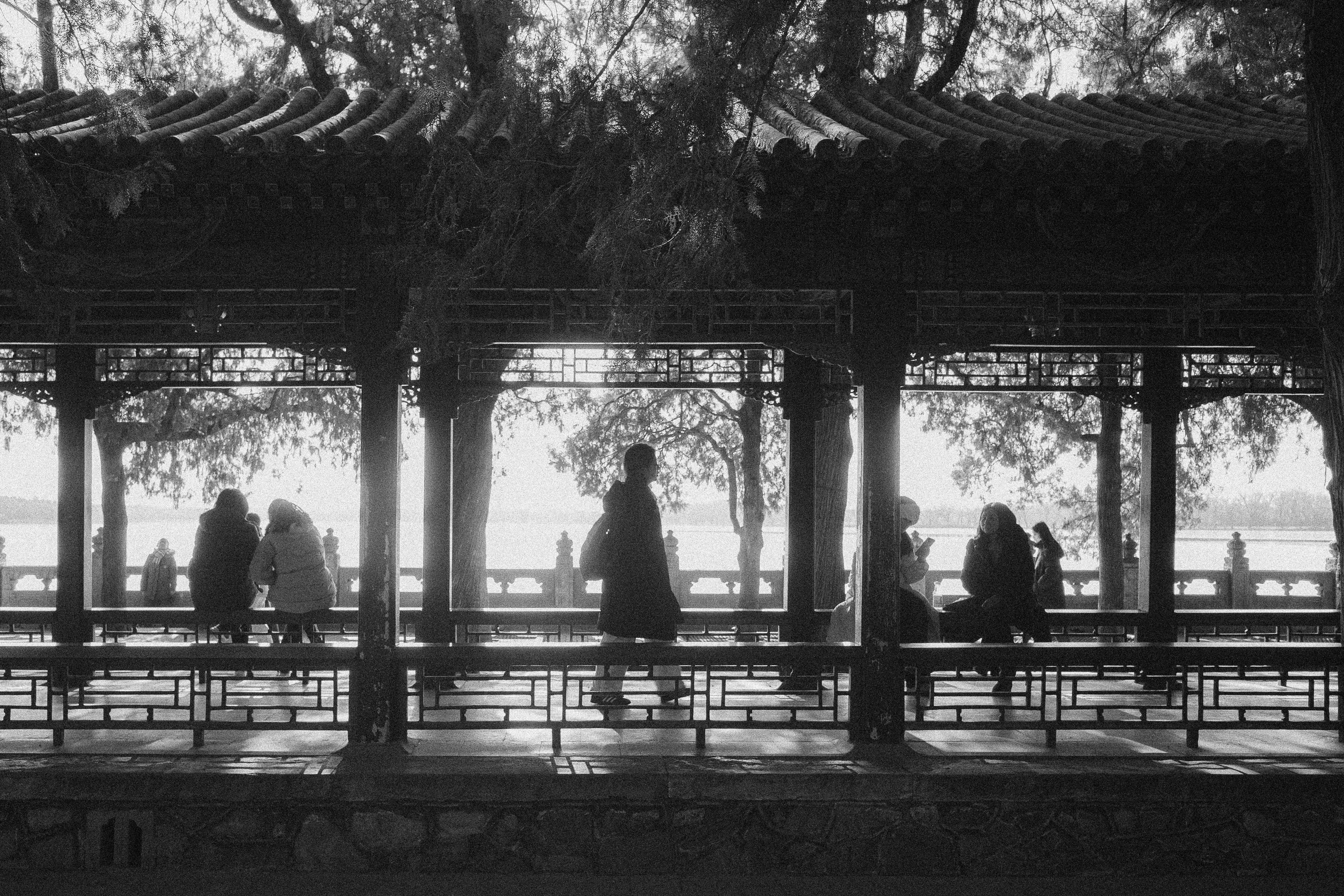 Silhouettes of people under a pavilion in a tranquil black and white park setting.