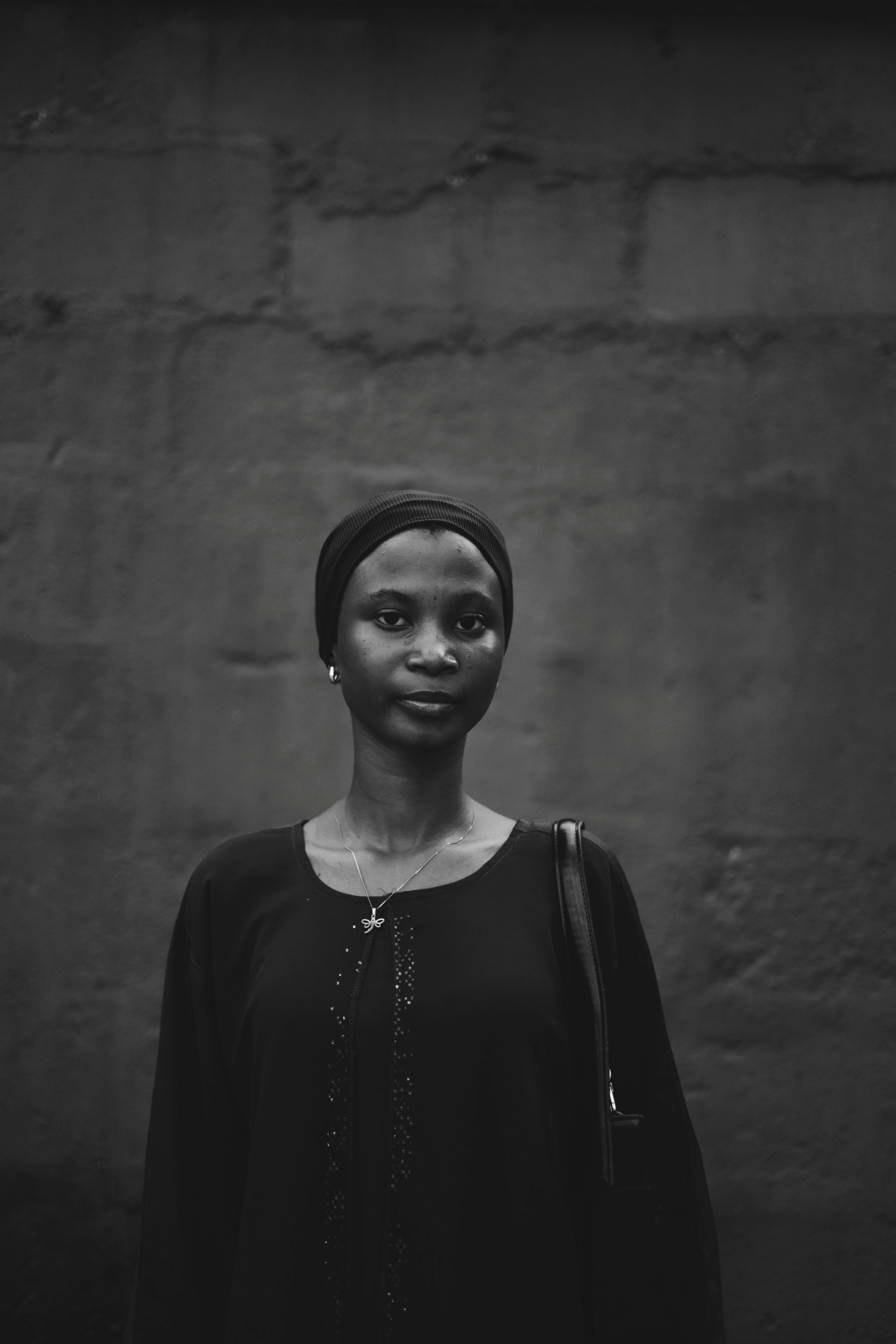 A striking black and white portrait of a young woman against an urban wall setting.