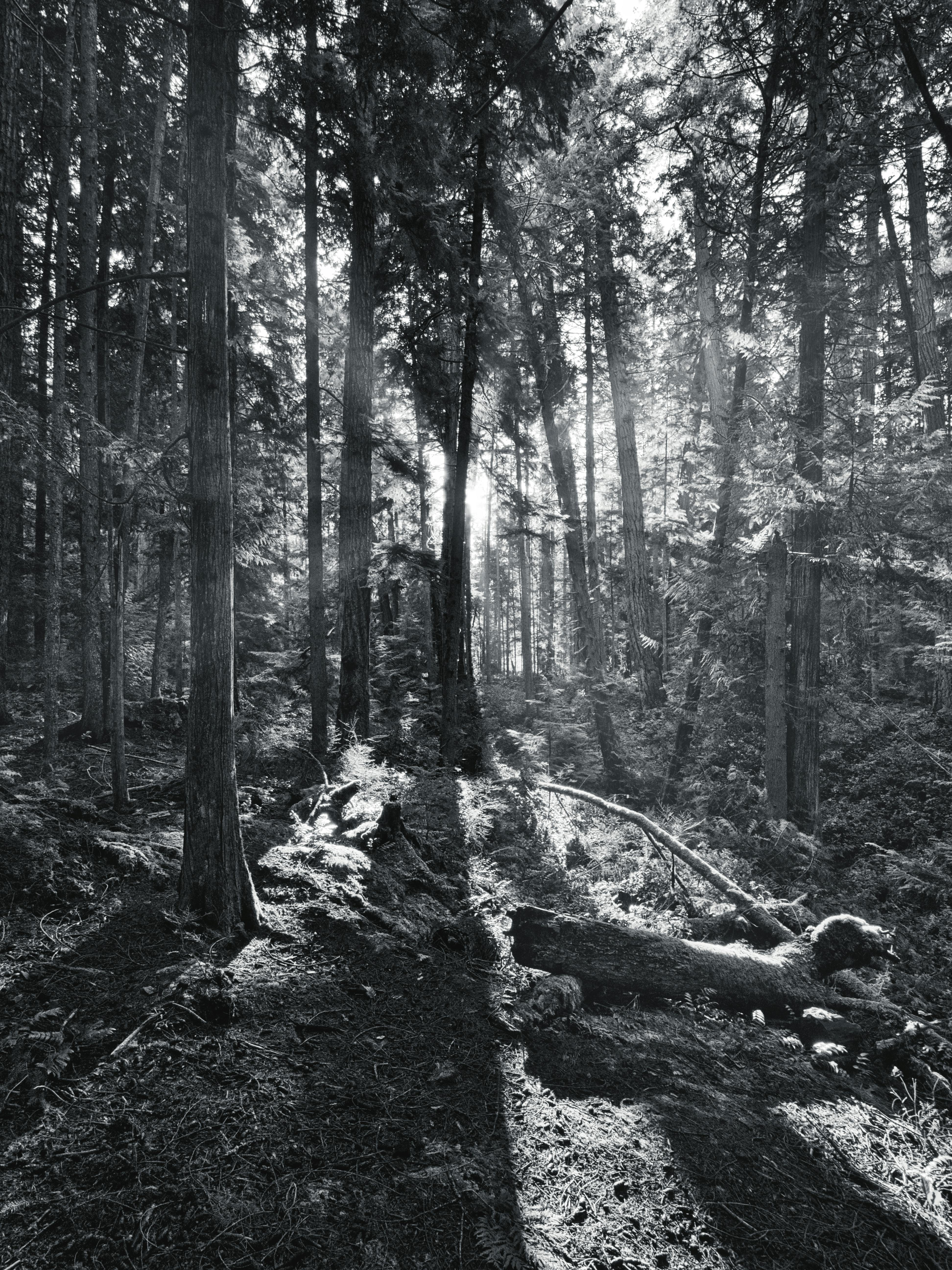 Black and white photo of a tranquil forest with sunlight filtering through trees.