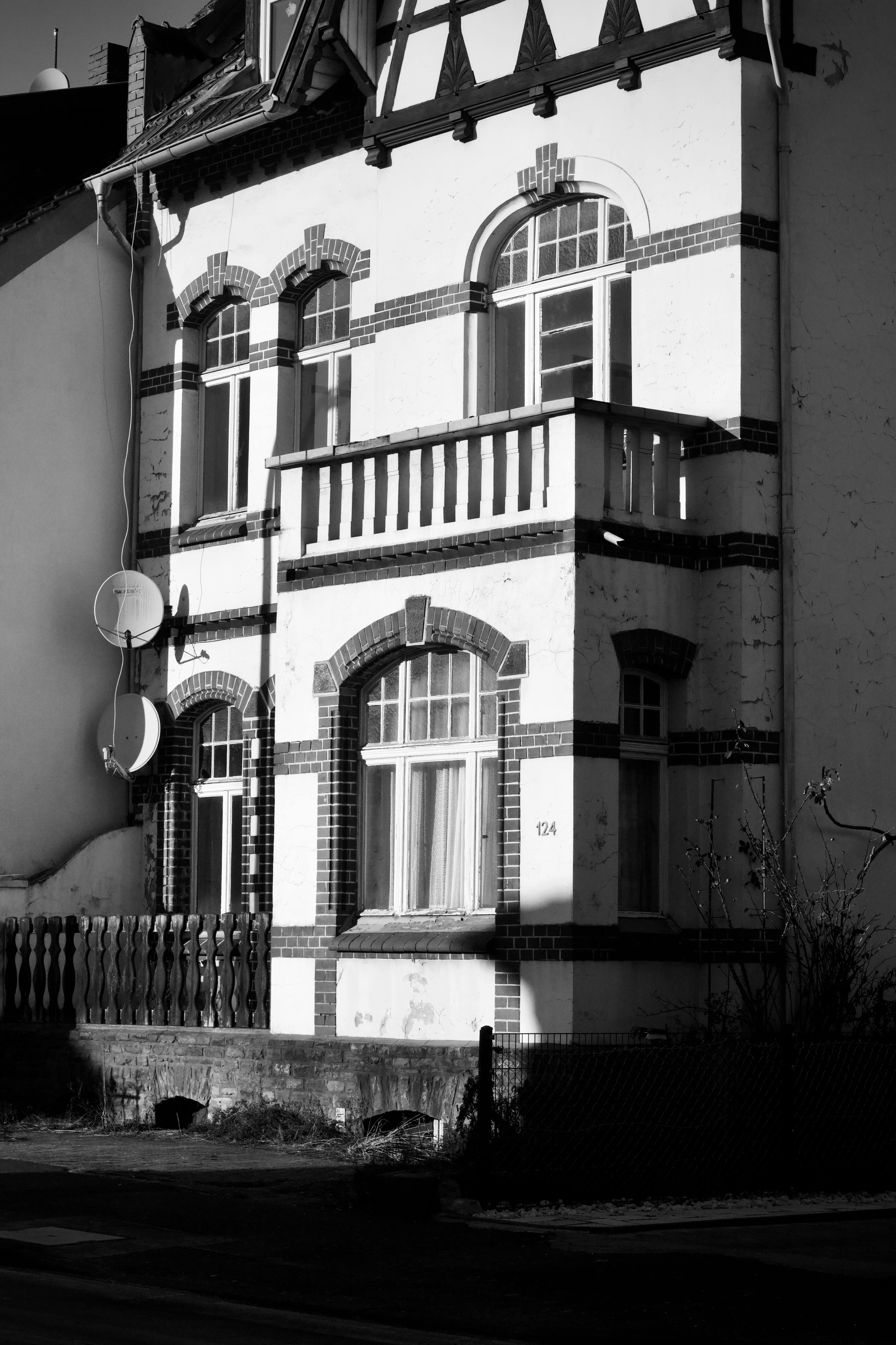 Black and white photo of a historic European building with brick details and balconies.