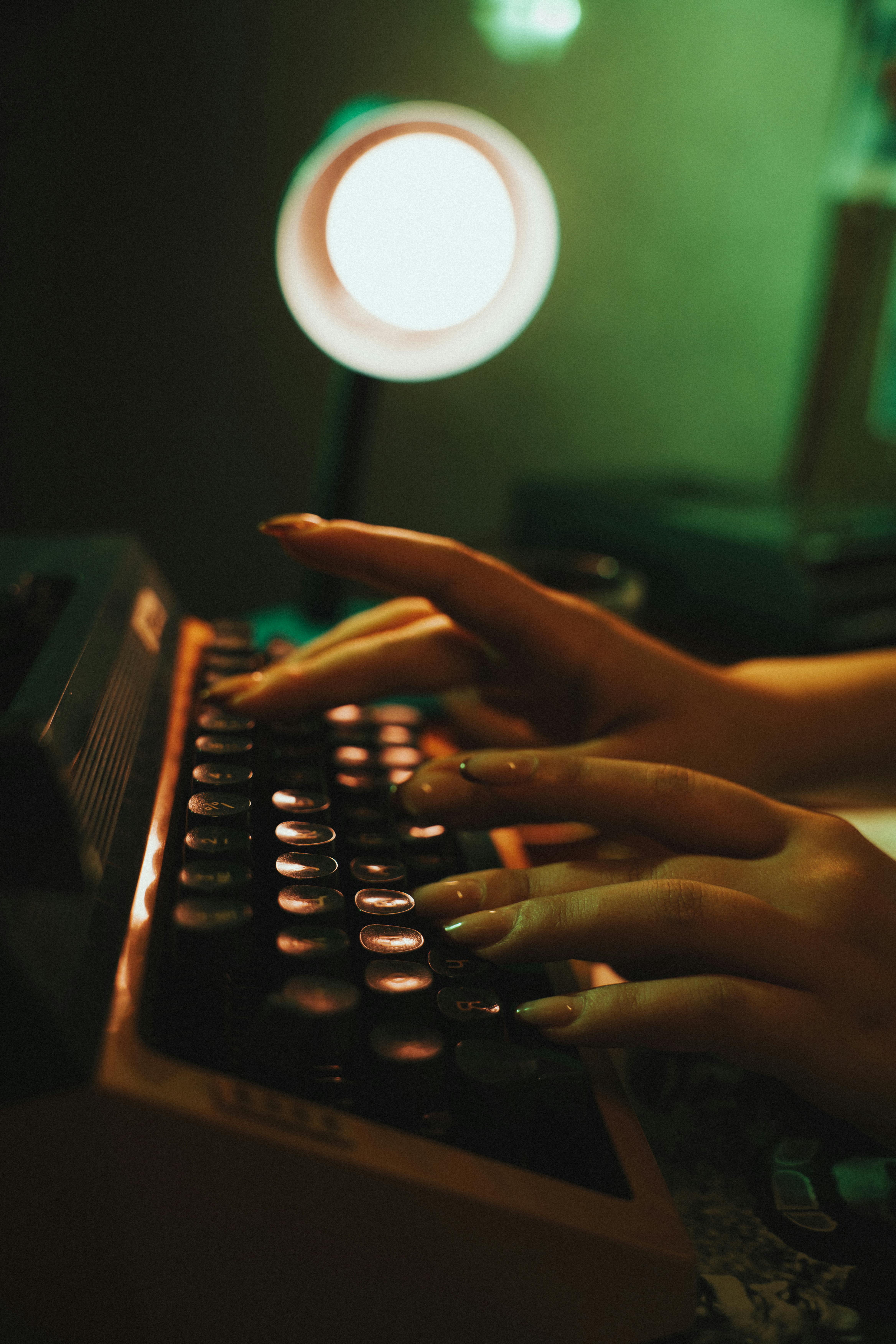 A woman's hands are typing on a vintage typewriter in a dimly lit room, creating a nostalgic atmosphere.