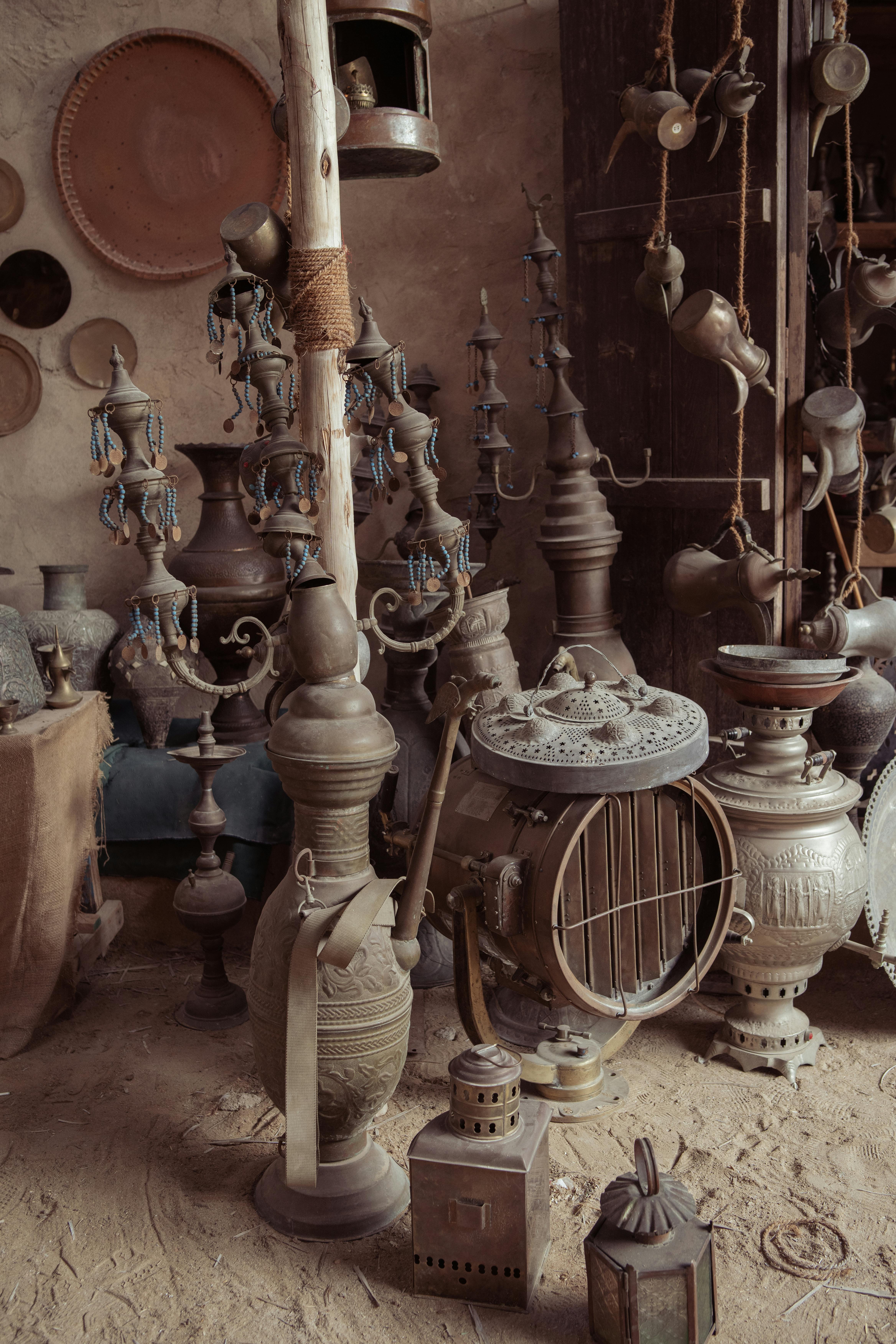 A collection of vintage Middle Eastern antiques and copperware in a rustic indoor setting.