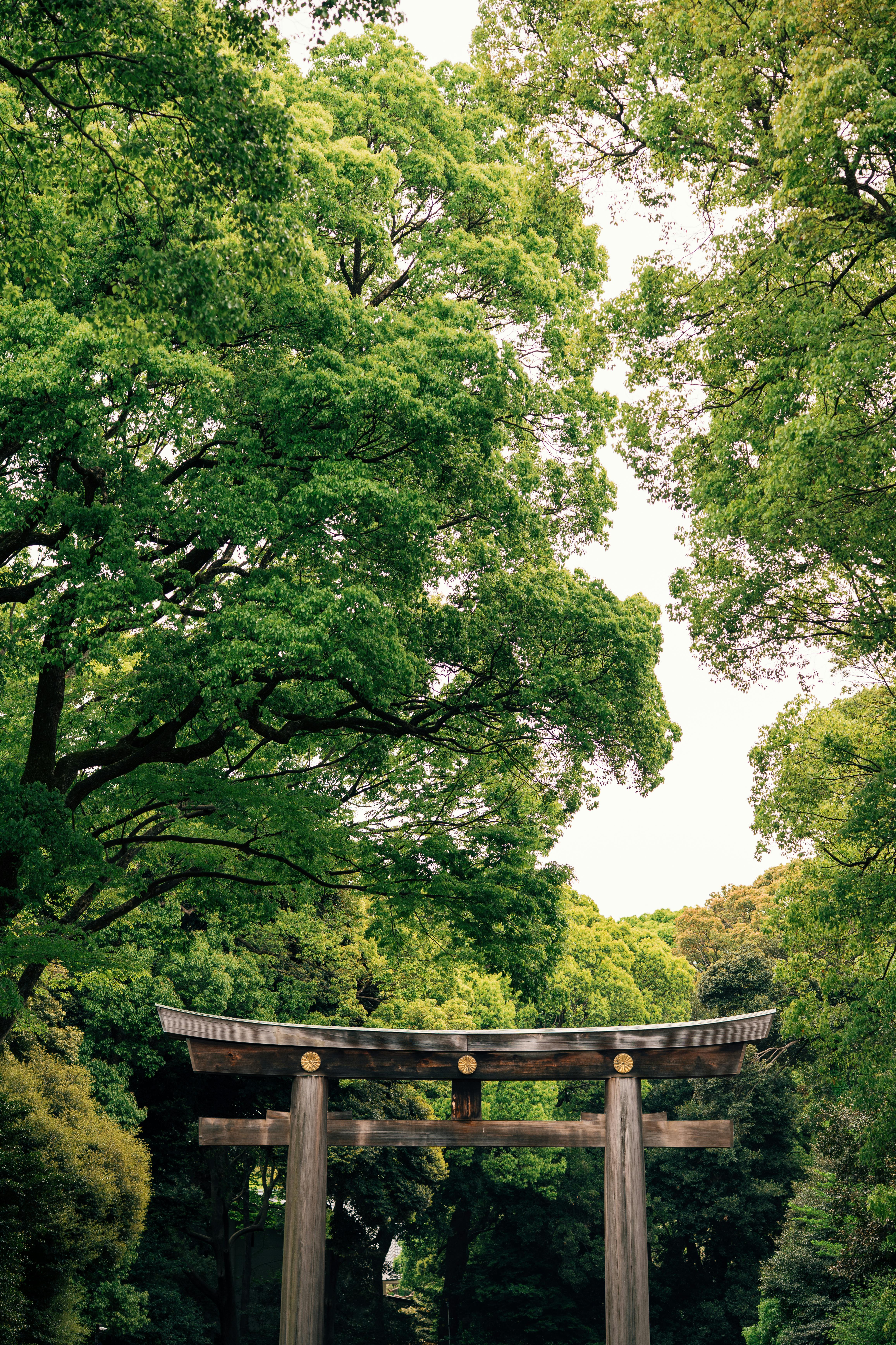 A peaceful view of the Meiji Jingu Torii gate surrounded by lush green trees in Tokyo, Japan.
