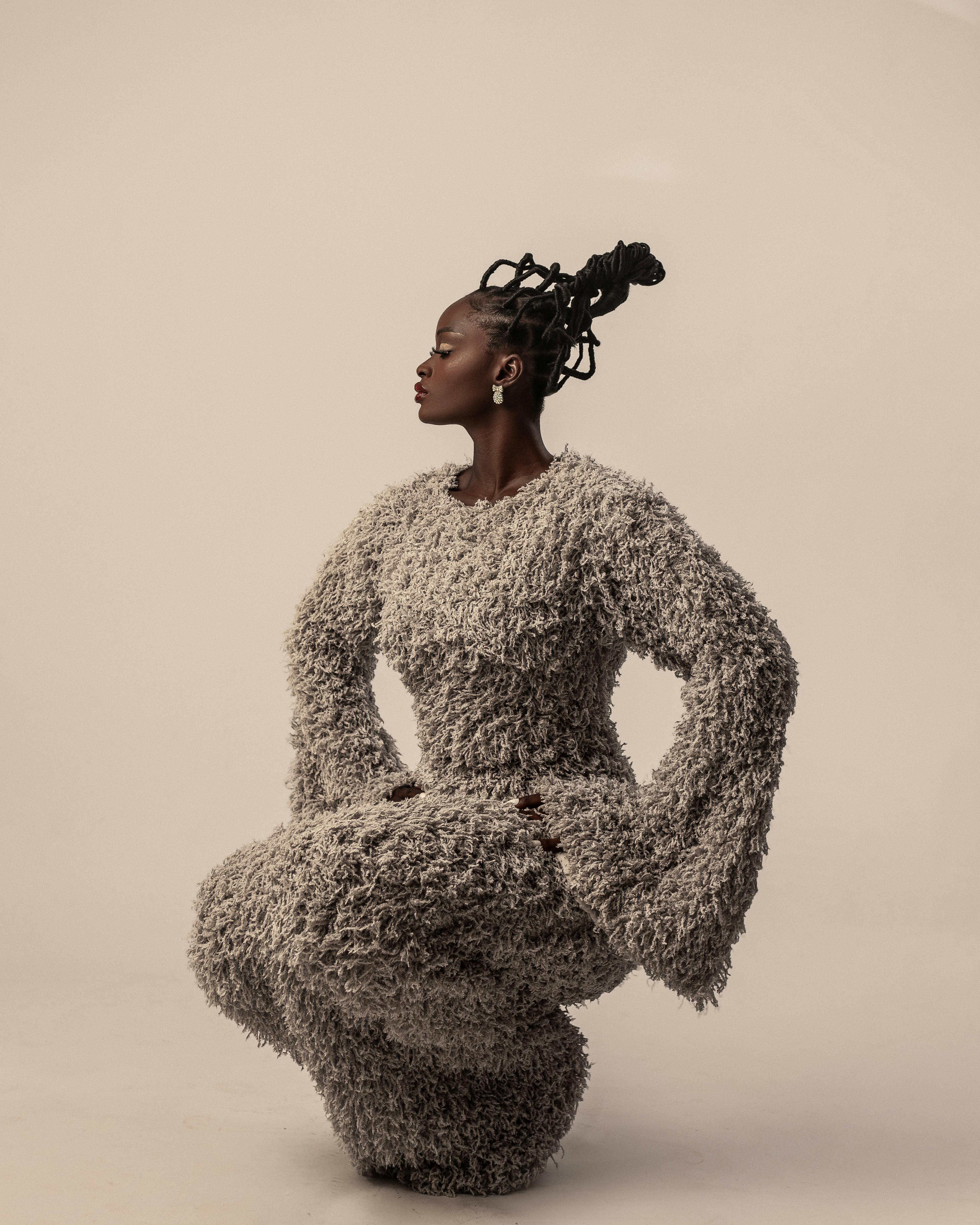 Elegant editorial fashion portrait of a woman in textured attire, showcasing style and grace.