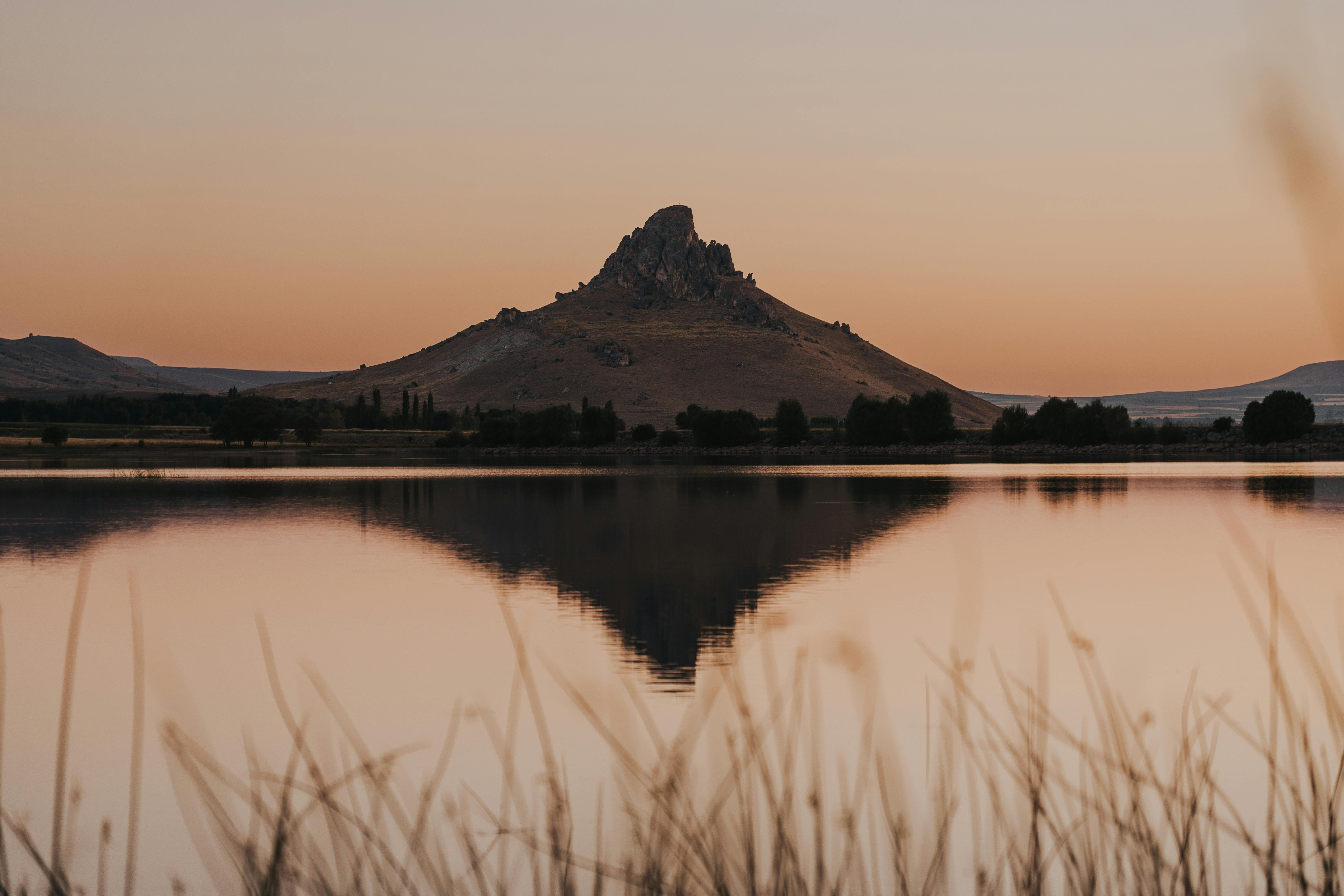 A serene view of a mountain reflecting in a calm lake during a vibrant sunset, creating a peaceful natural landscape.