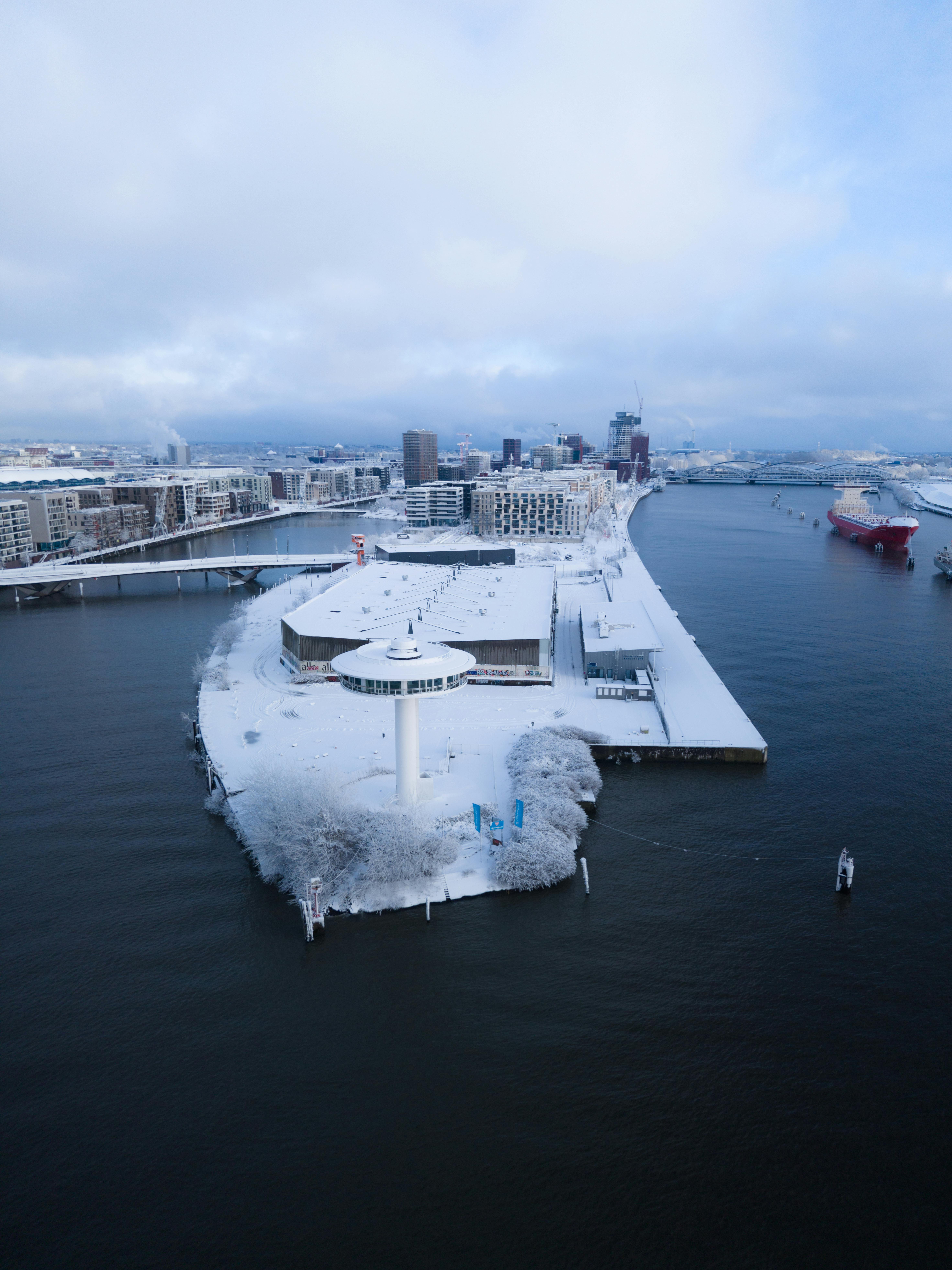 Snow-covered HafenCity in Hamburg captured from above, showcasing modern architecture.