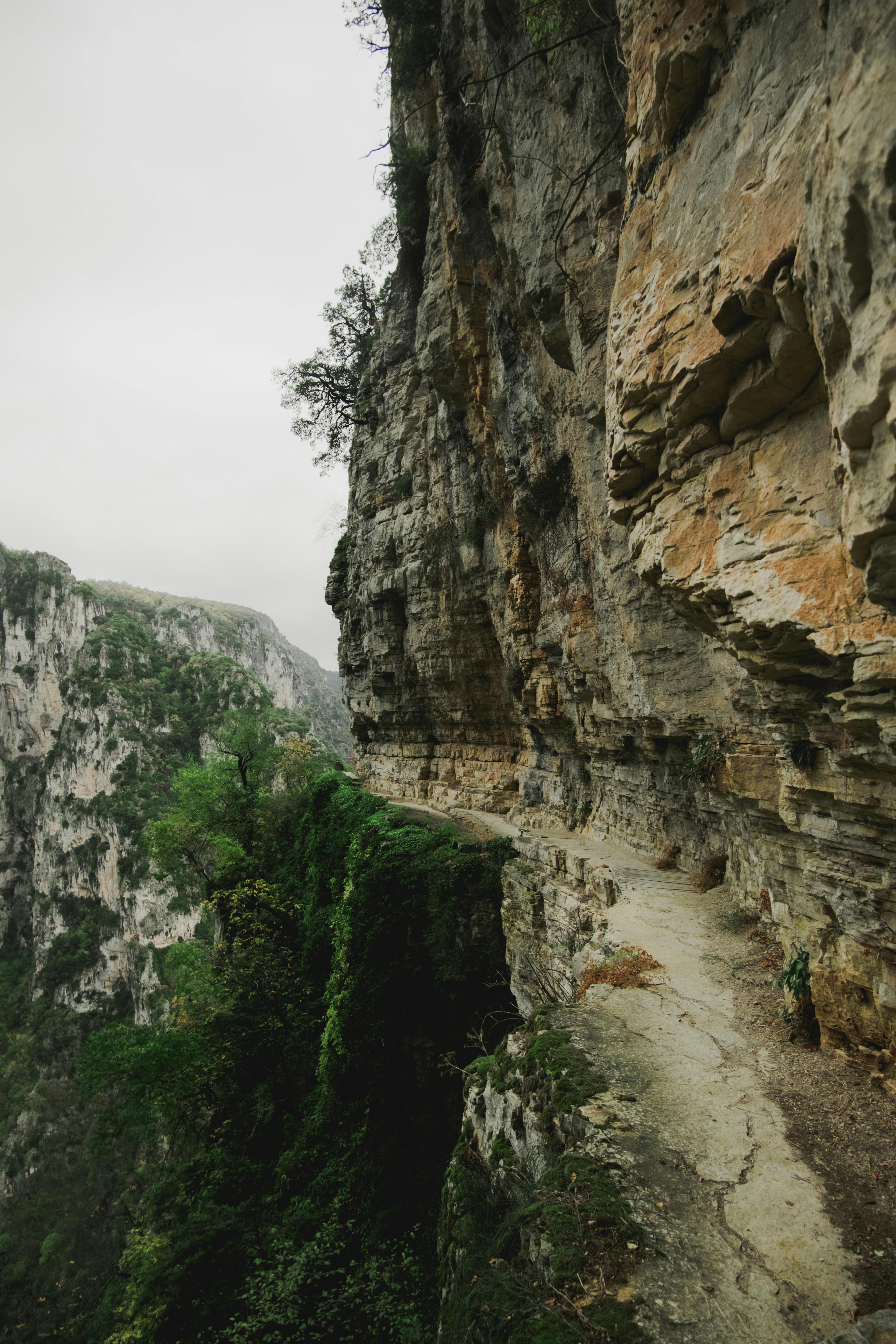 A rugged mountain path clings to a steep cliff, showcasing nature's raw beauty.