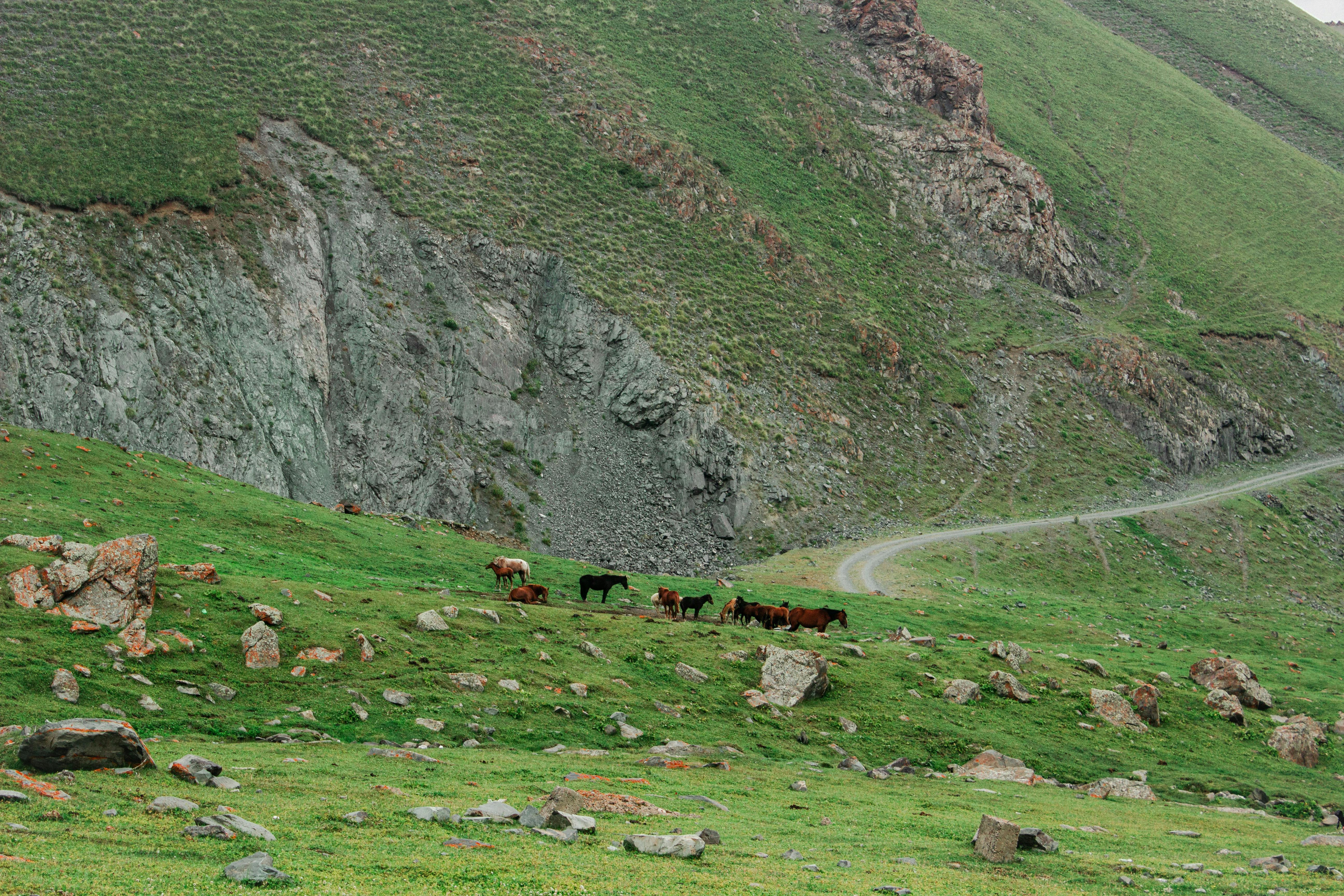 Horses roaming a lush green valley in Чуйская область, Кыргызстан, with rugged mountain backdrop.