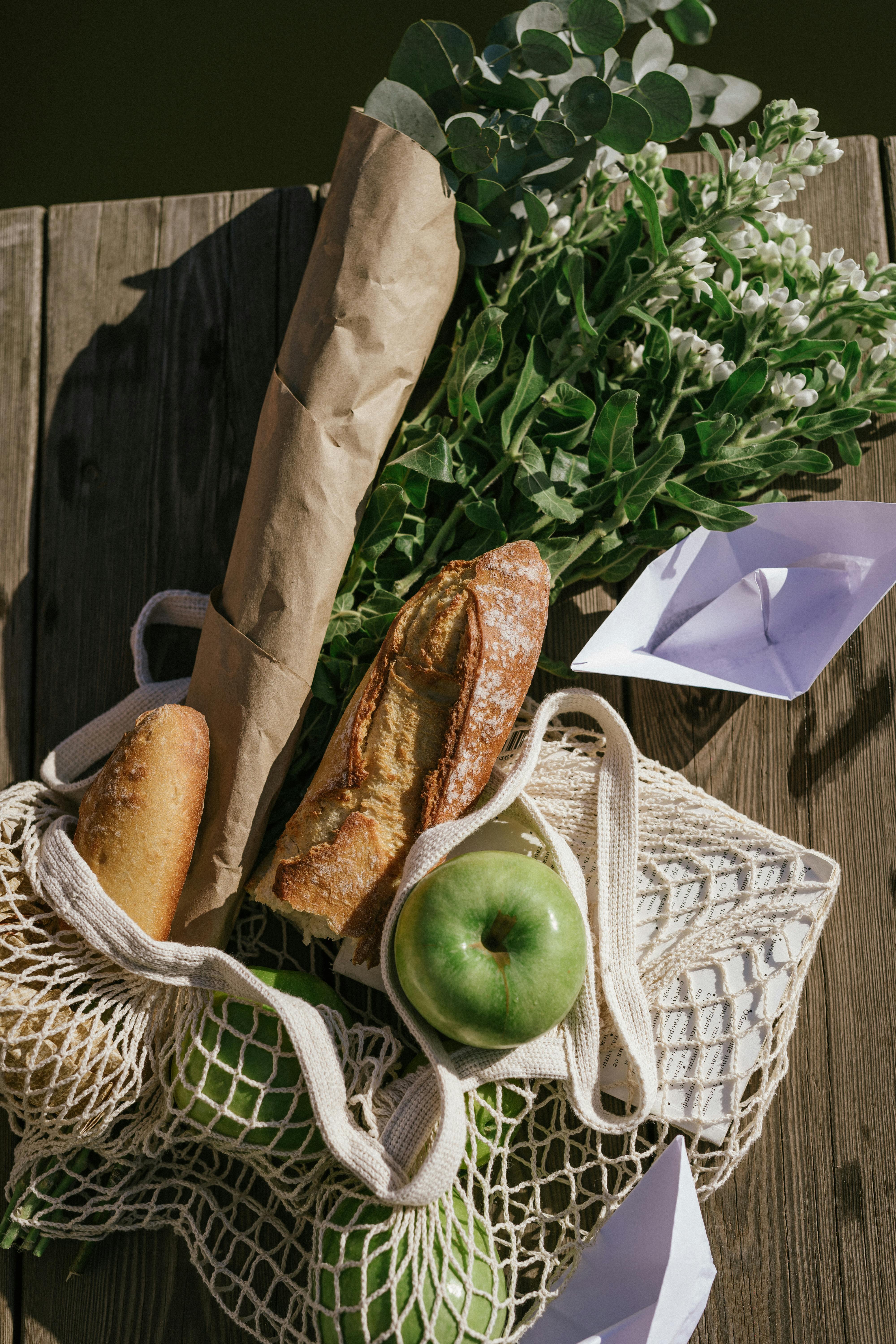 Picnic arrangement featuring fresh bread, green apples, and a flower bouquet on a wooden surface.