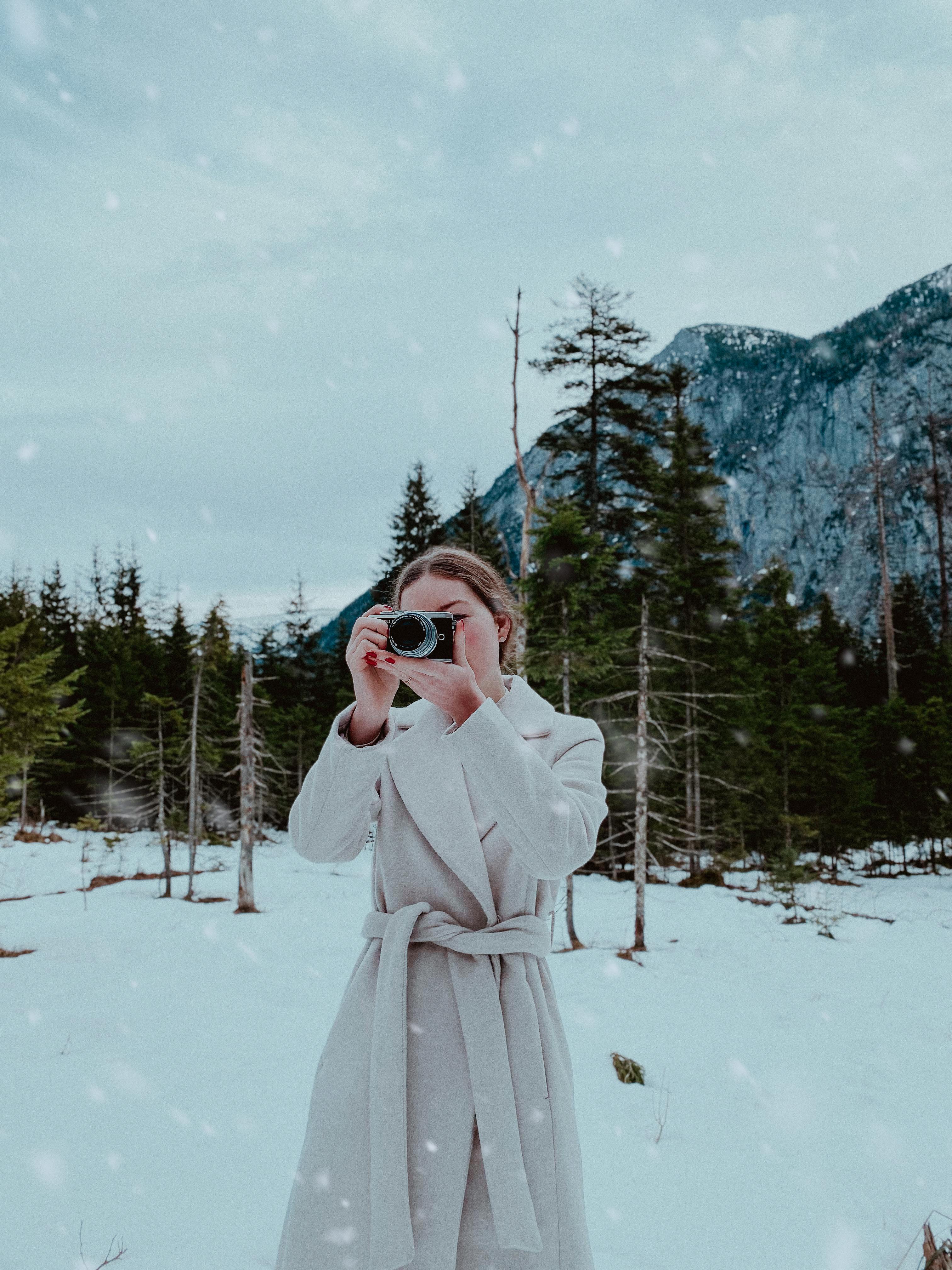 Woman in winter coat photographing a snowy, mountainous forest with an analog camera.