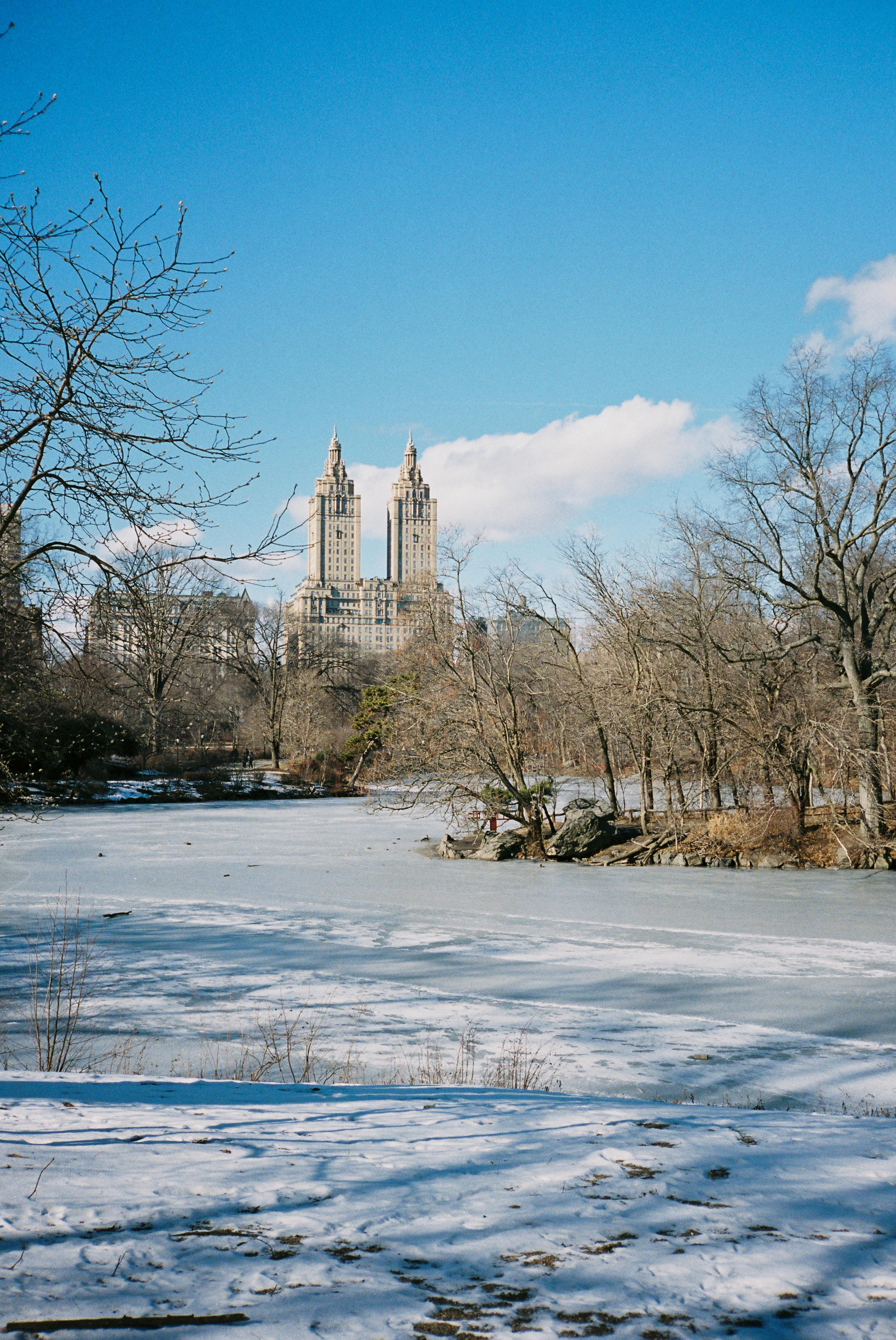 Winter scene in Central Park, New York City, featuring the iconic skyline under a clear blue sky.