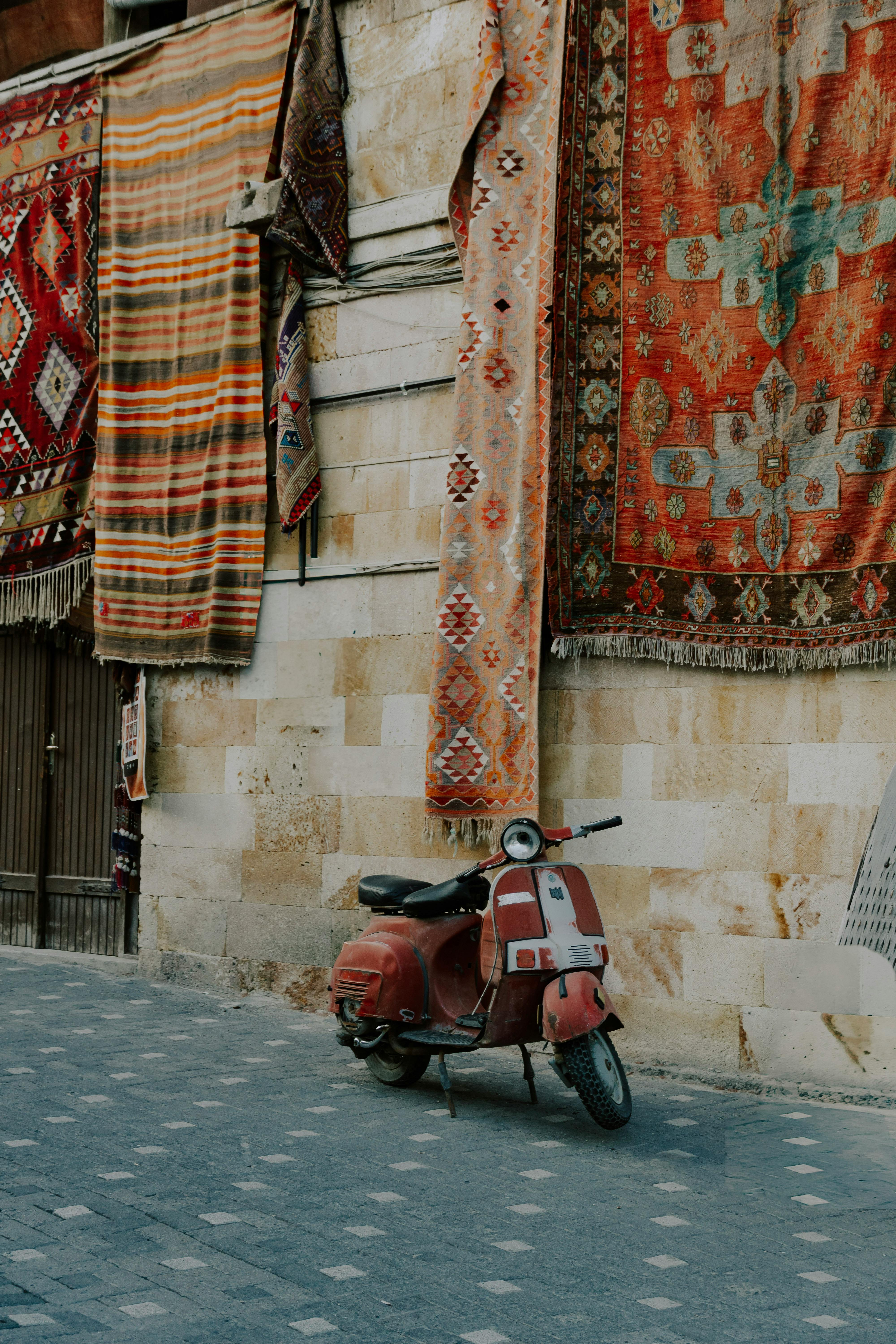 Vintage scooter parked by a wall adorned with colorful tapestries.