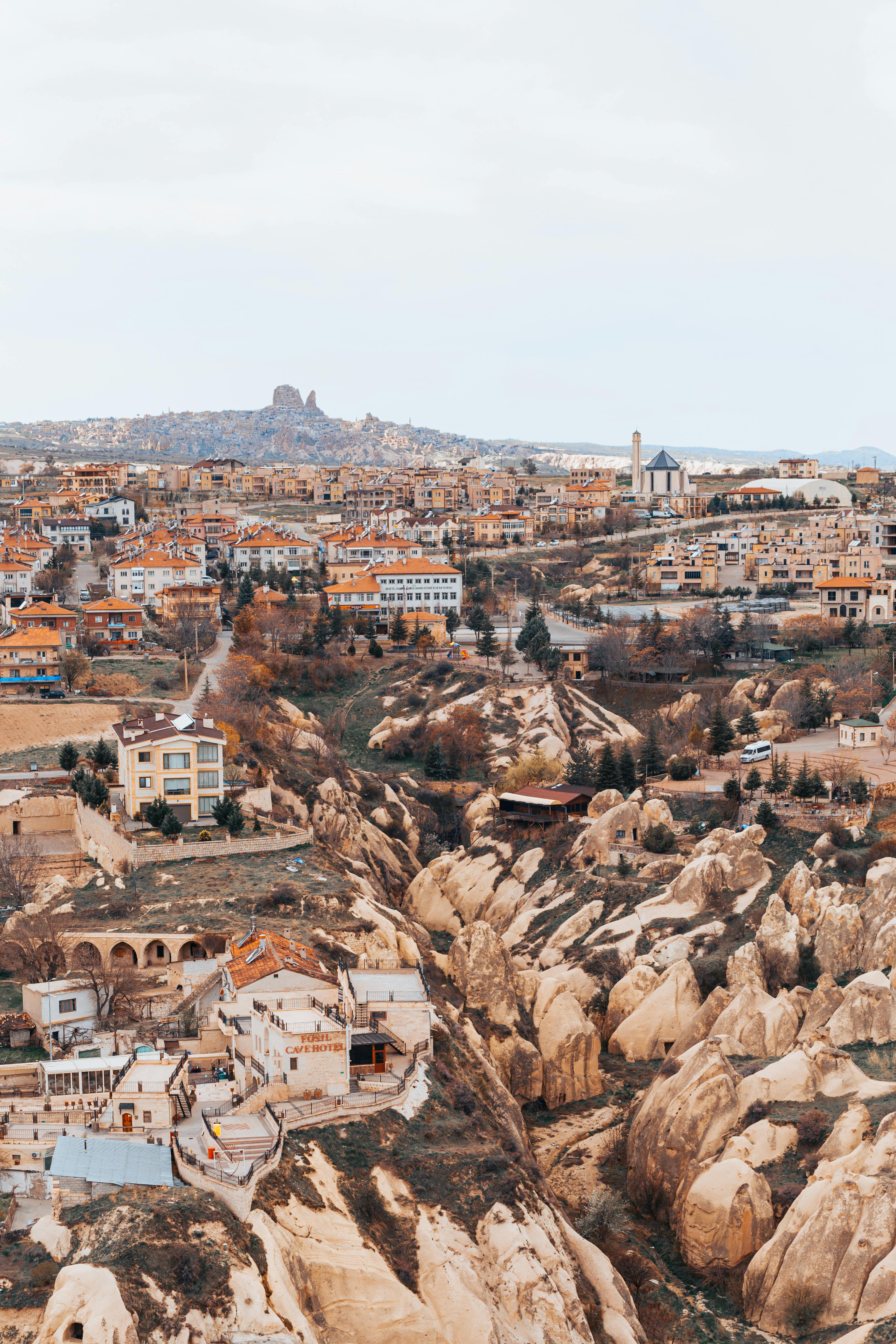 A stunning aerial view capturing the unique rock formations and townscape of Cappadocia, Turkey.