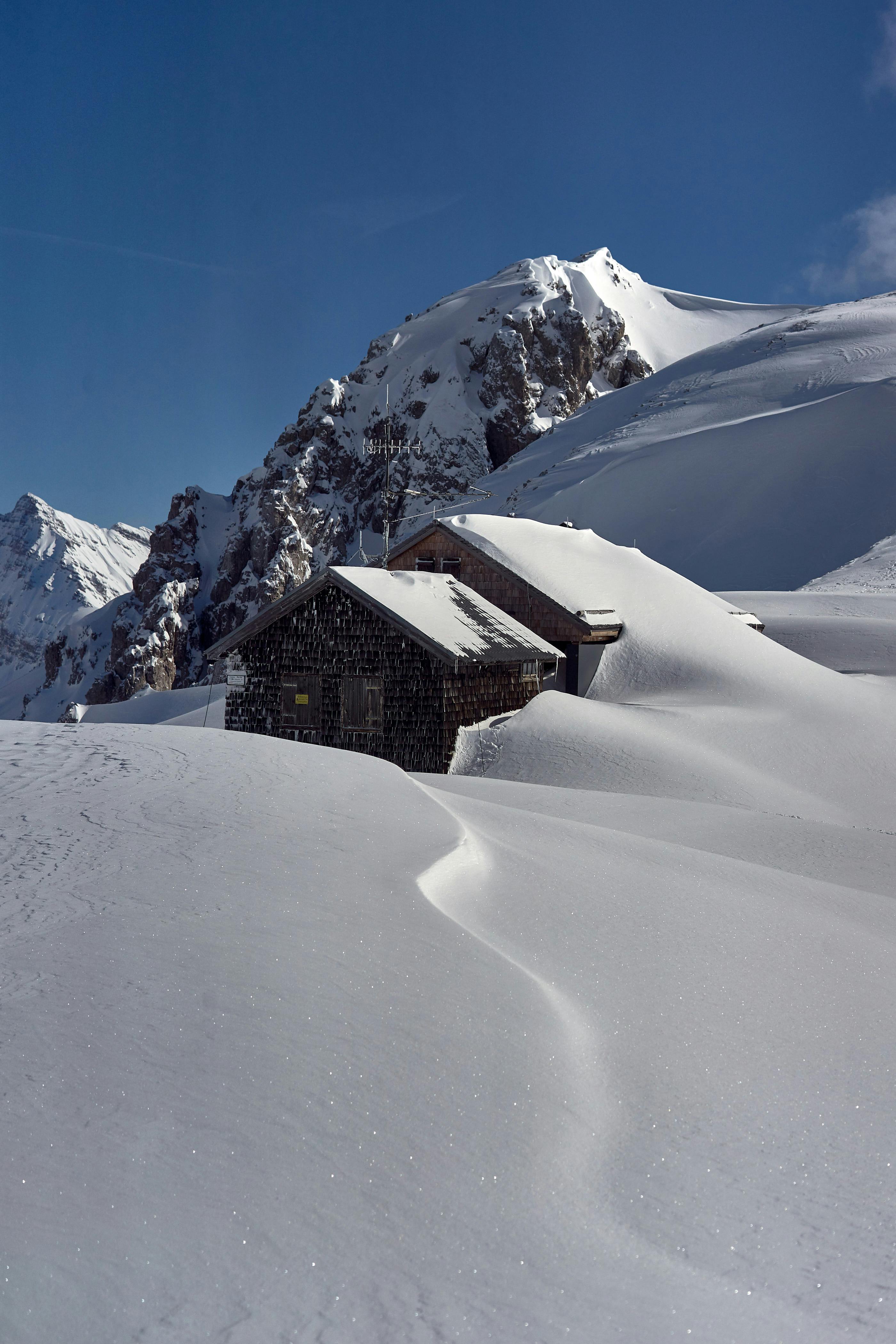 Scenic view of a wooden cabin surrounded by snow-covered peaks in a sunlit alpine setting.