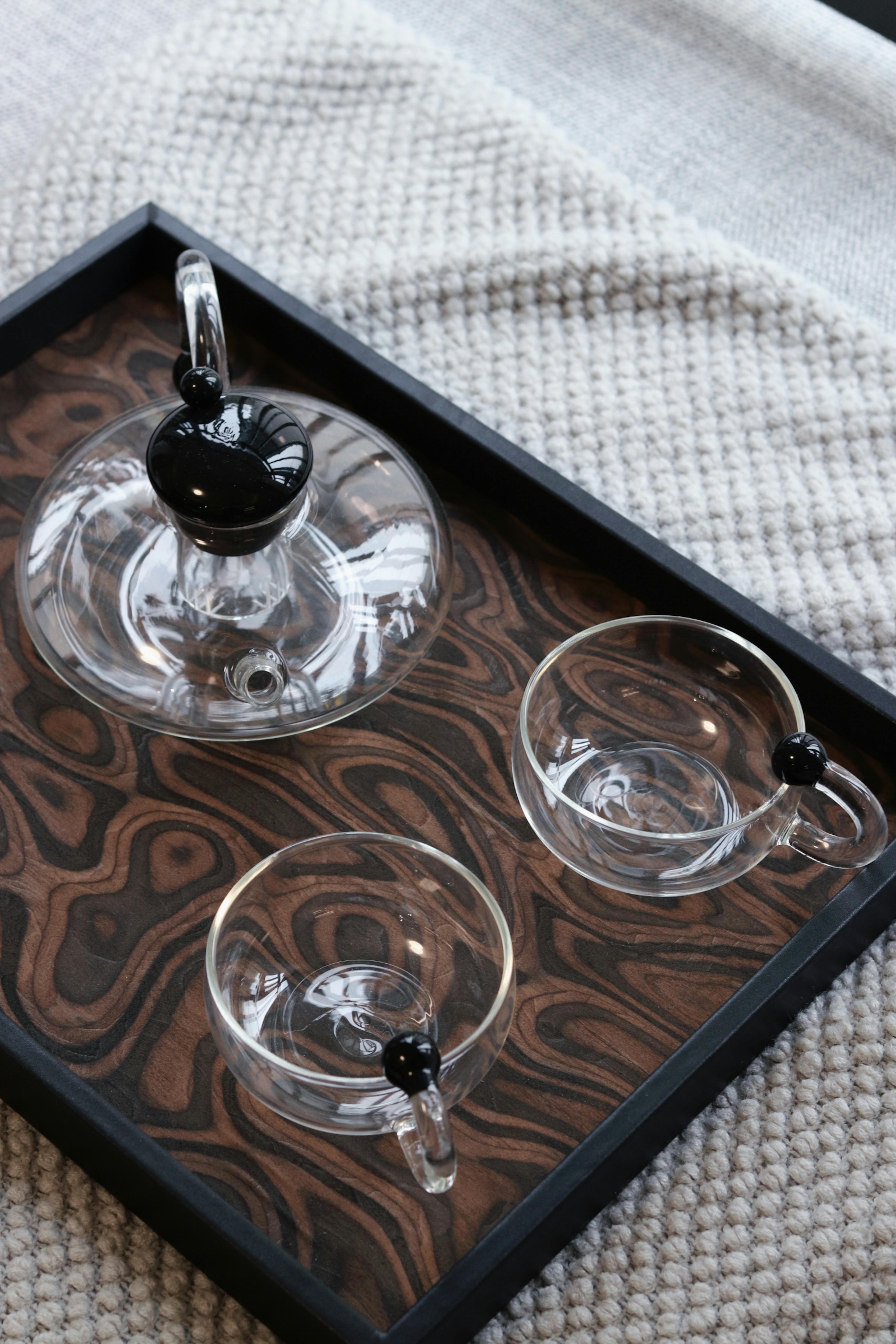 Minimalist glass teapot set on textured wooden tray with cozy rug backdrop.