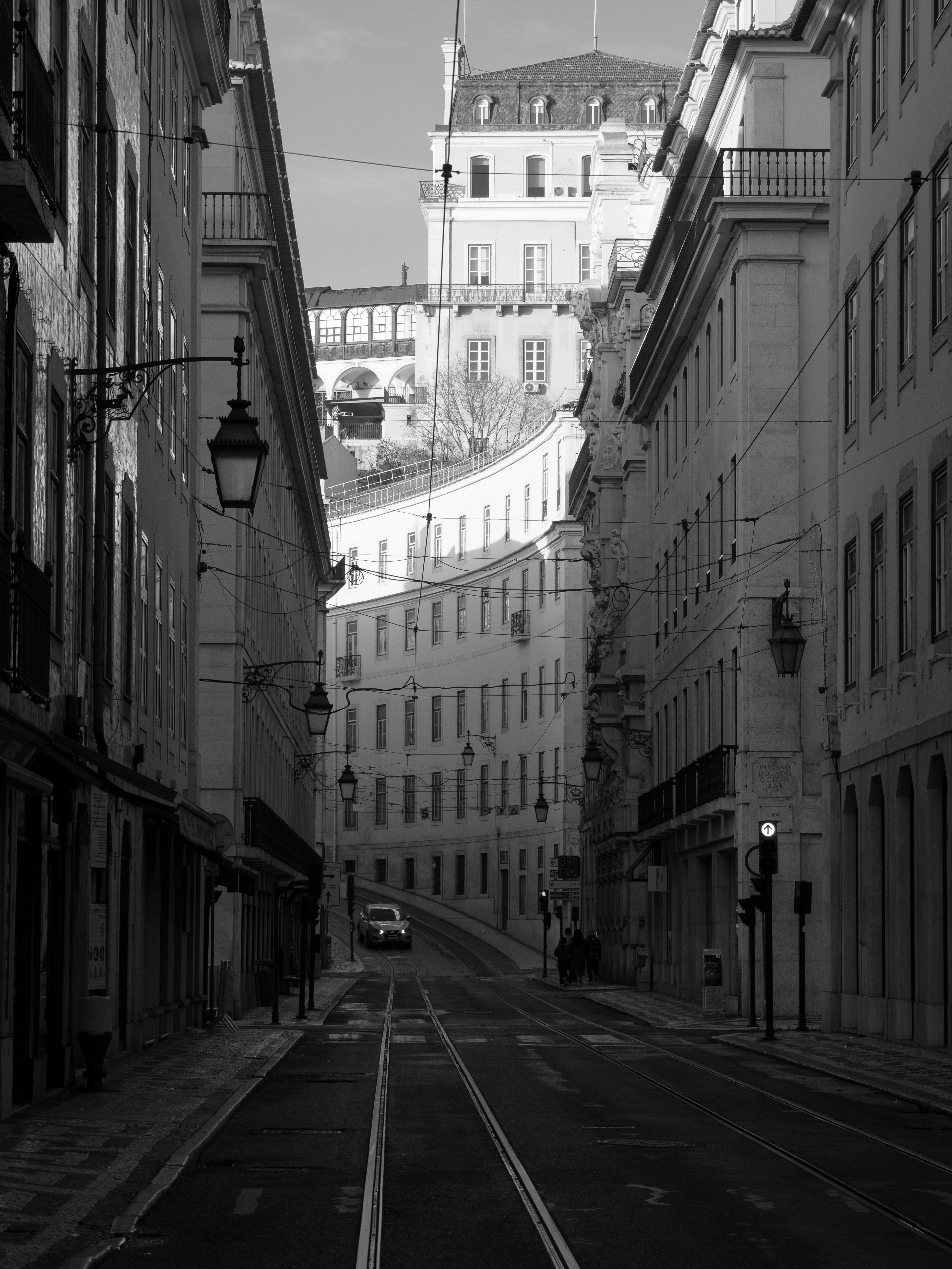 Captivating black and white image of a Lisbon street showcasing architecture and a scenic hill in the background.