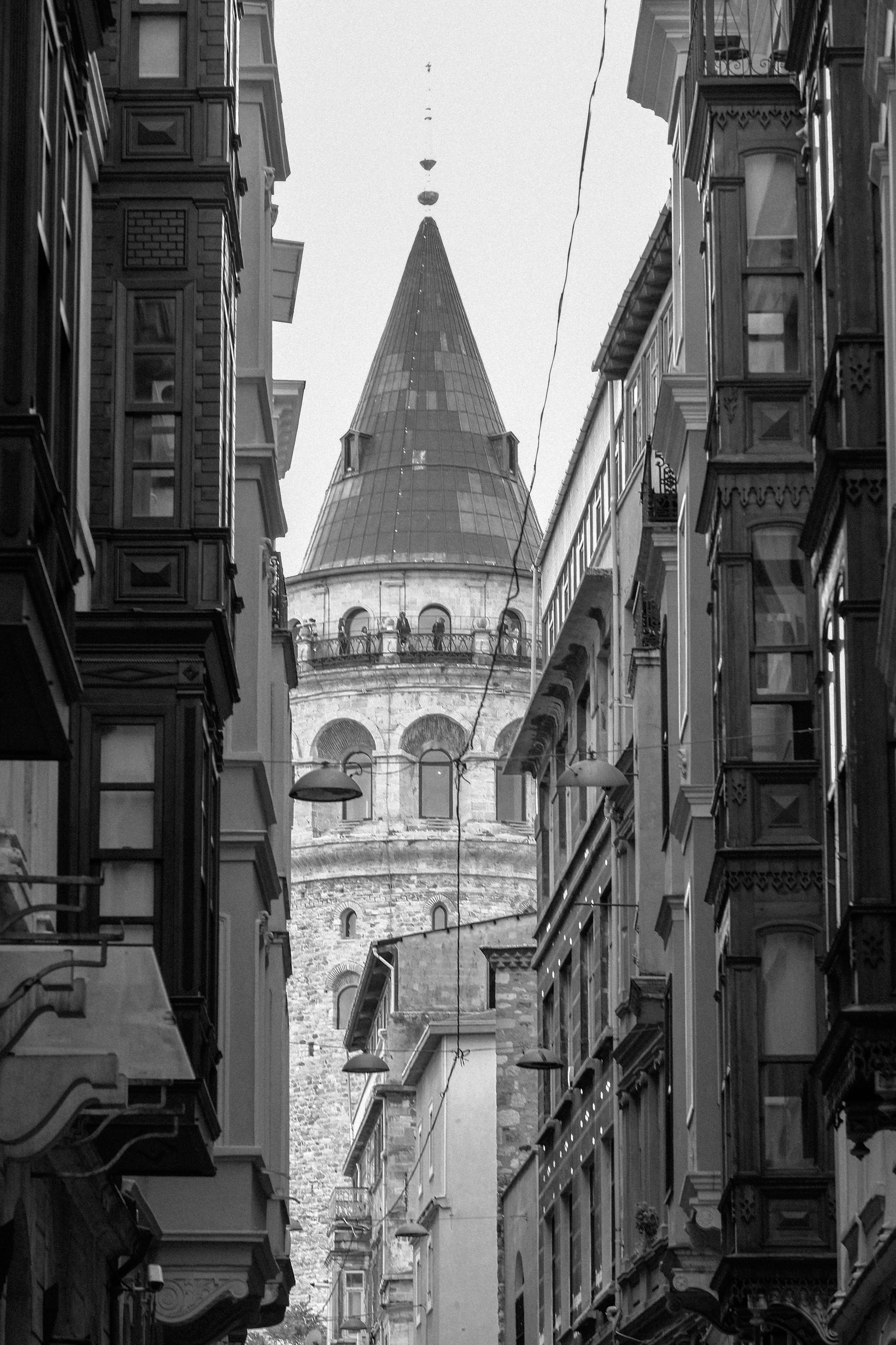 Black and white view of Galata Tower framed by classic architecture in the heart of Istanbul.