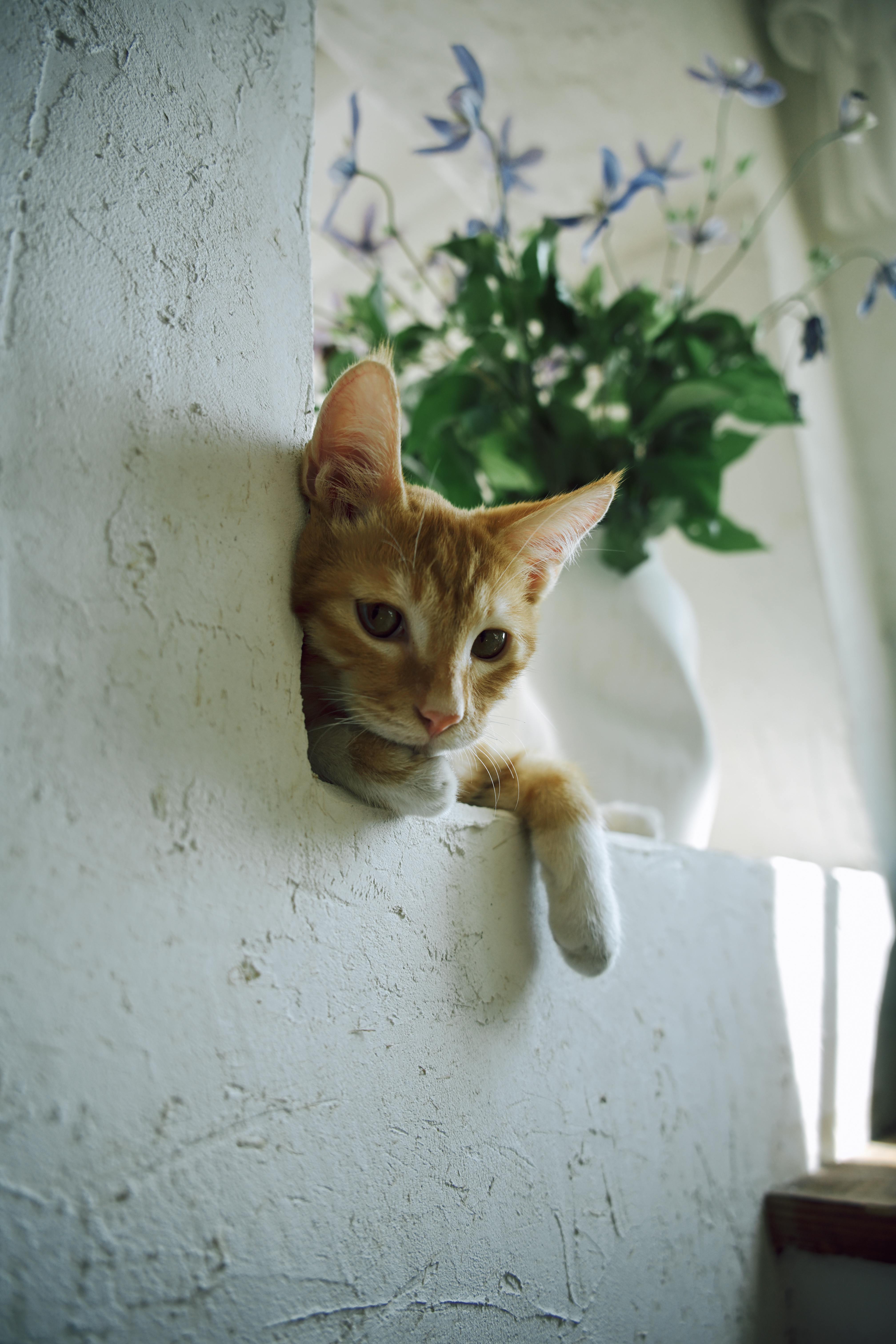 A ginger cat lounging in a peaceful indoor space with floral background.