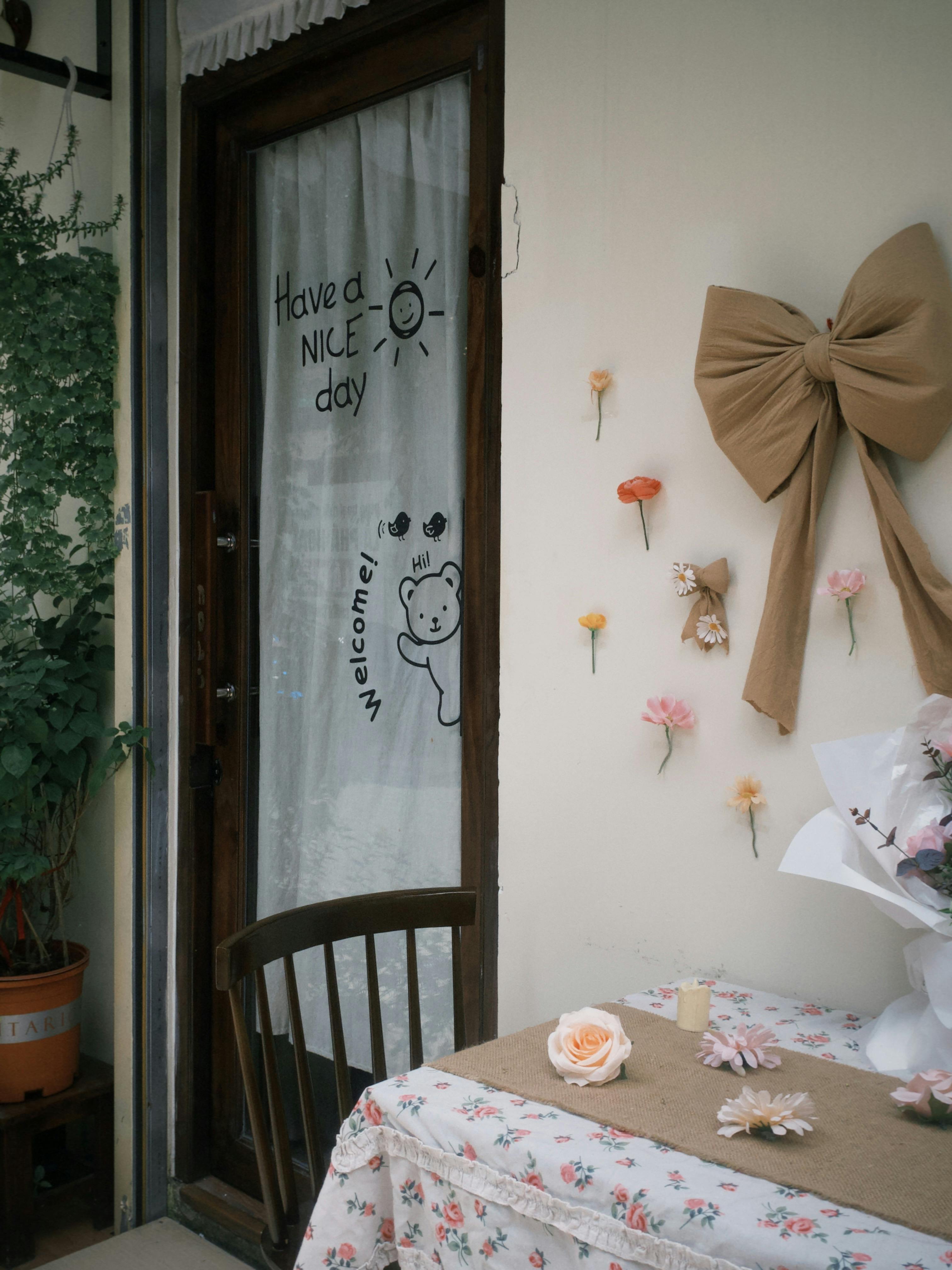 Cozy outdoor setting with floral table and welcome message on door.