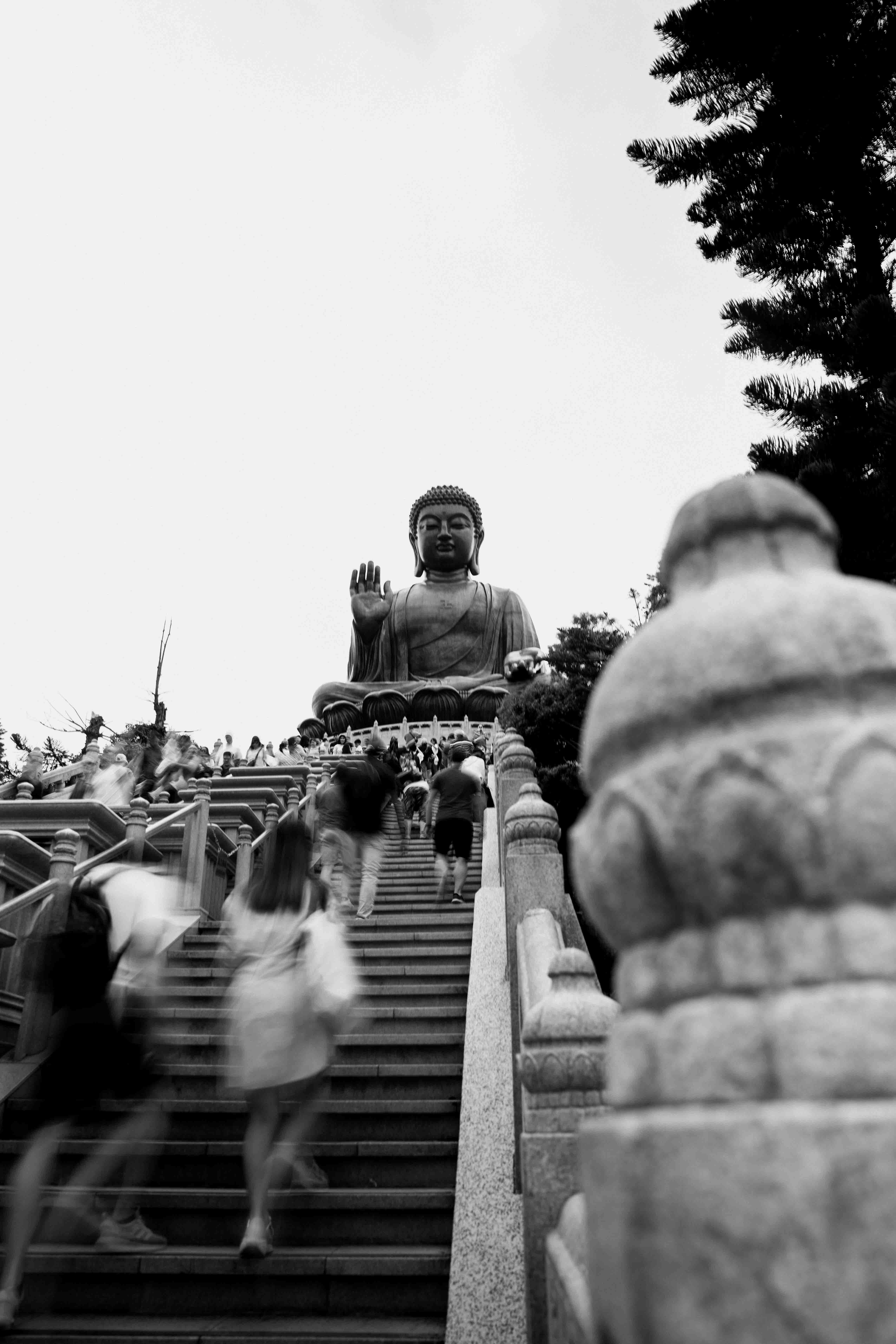Visitors climb stairs to the Tian Tan Buddha in Hong Kong, captured in black and white.