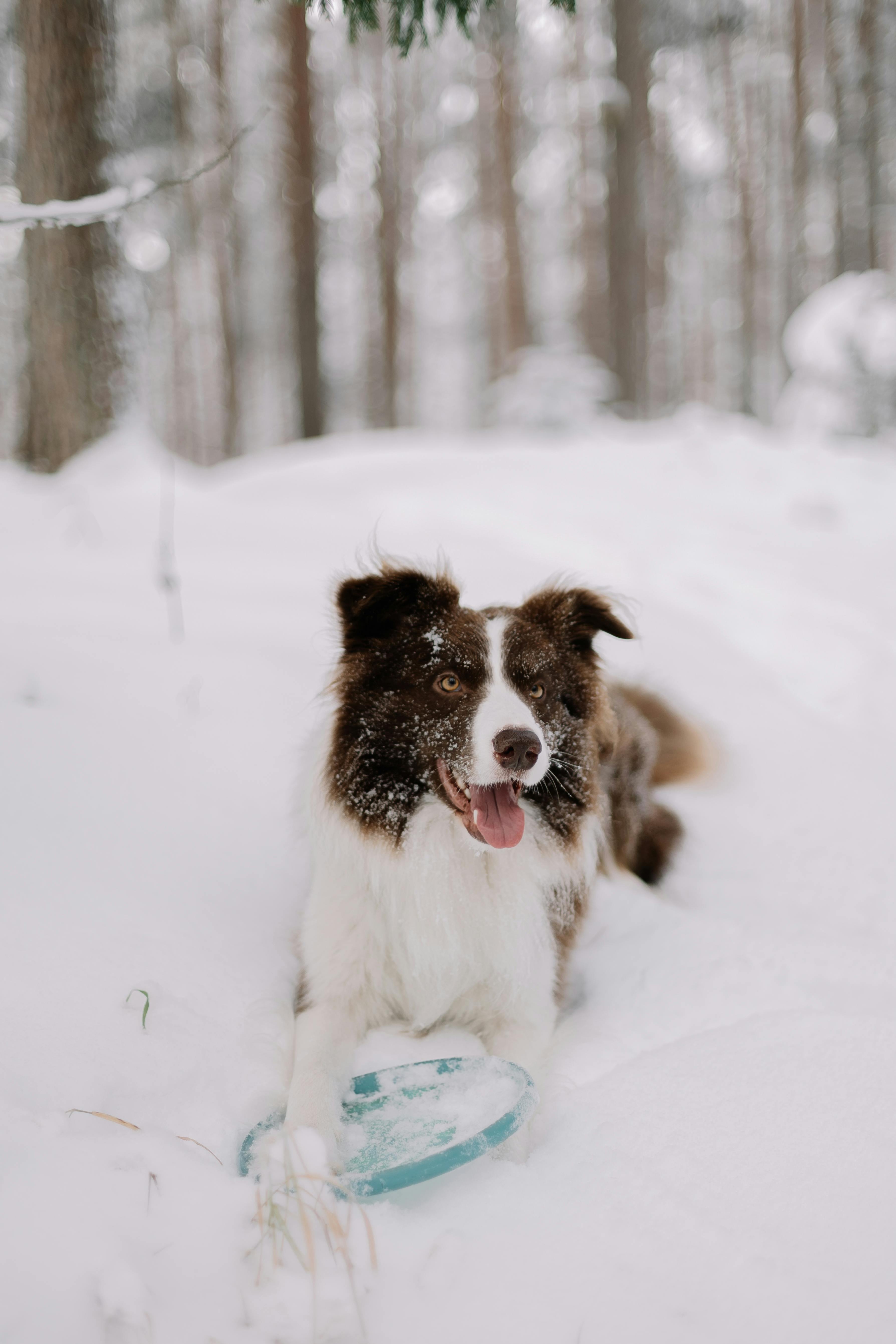 A playful border collie lies in a snowy forest with a frisbee in its paws, exuding joy.