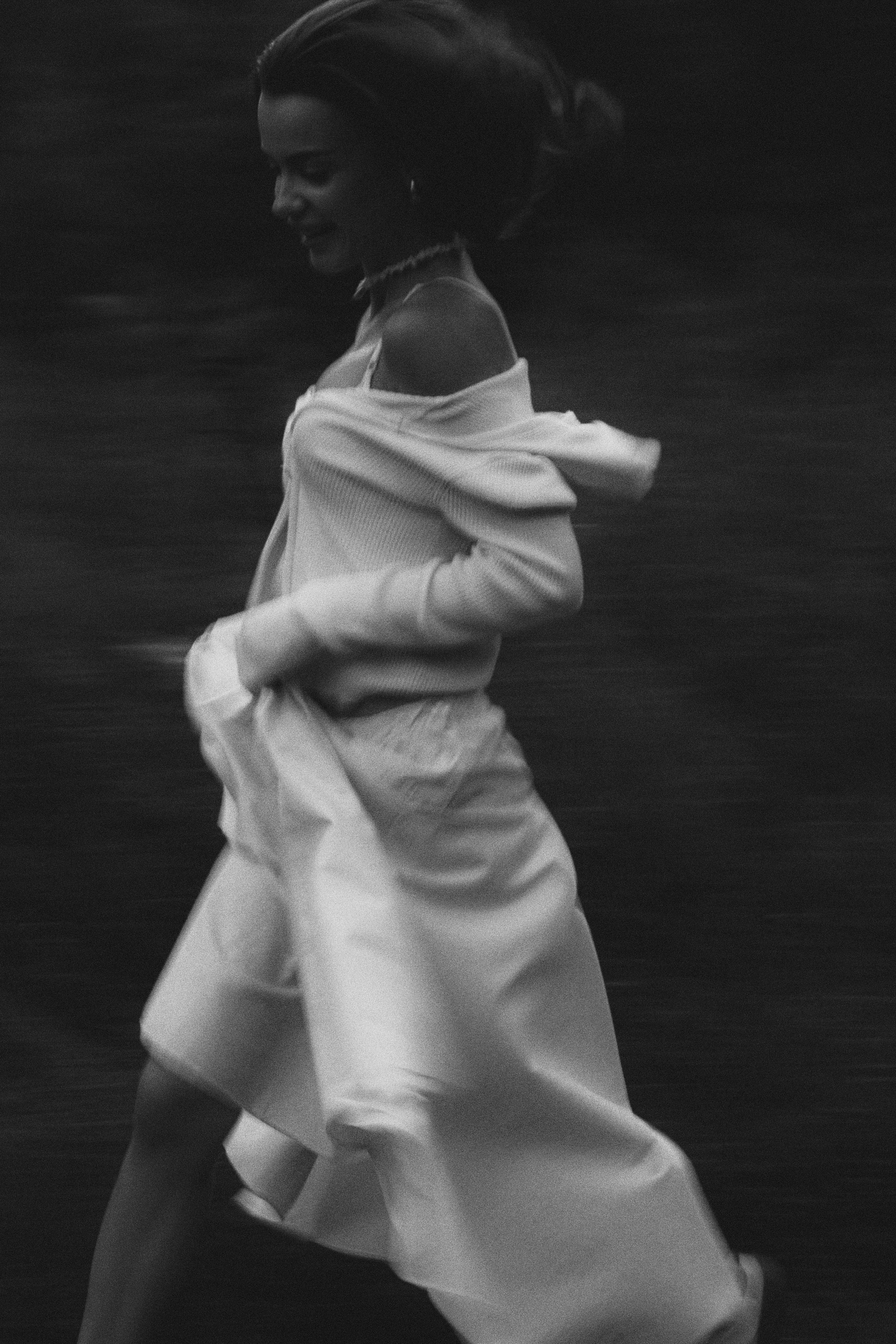 Side view of a woman in motion, wearing flowing clothing in monochrome.