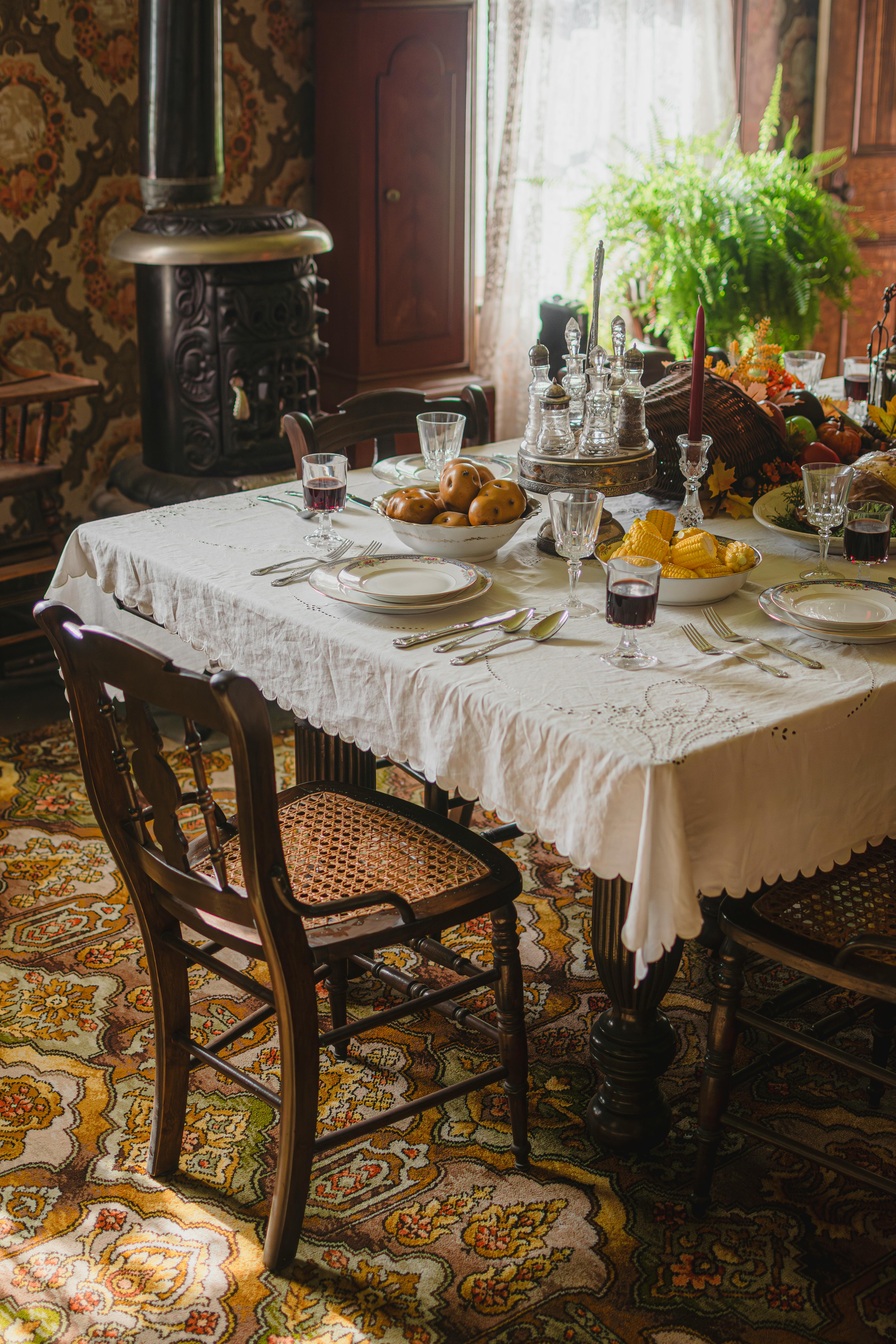 A beautifully set Victorian-style dining table in Oakville, Ontario, evoking a vintage charm.