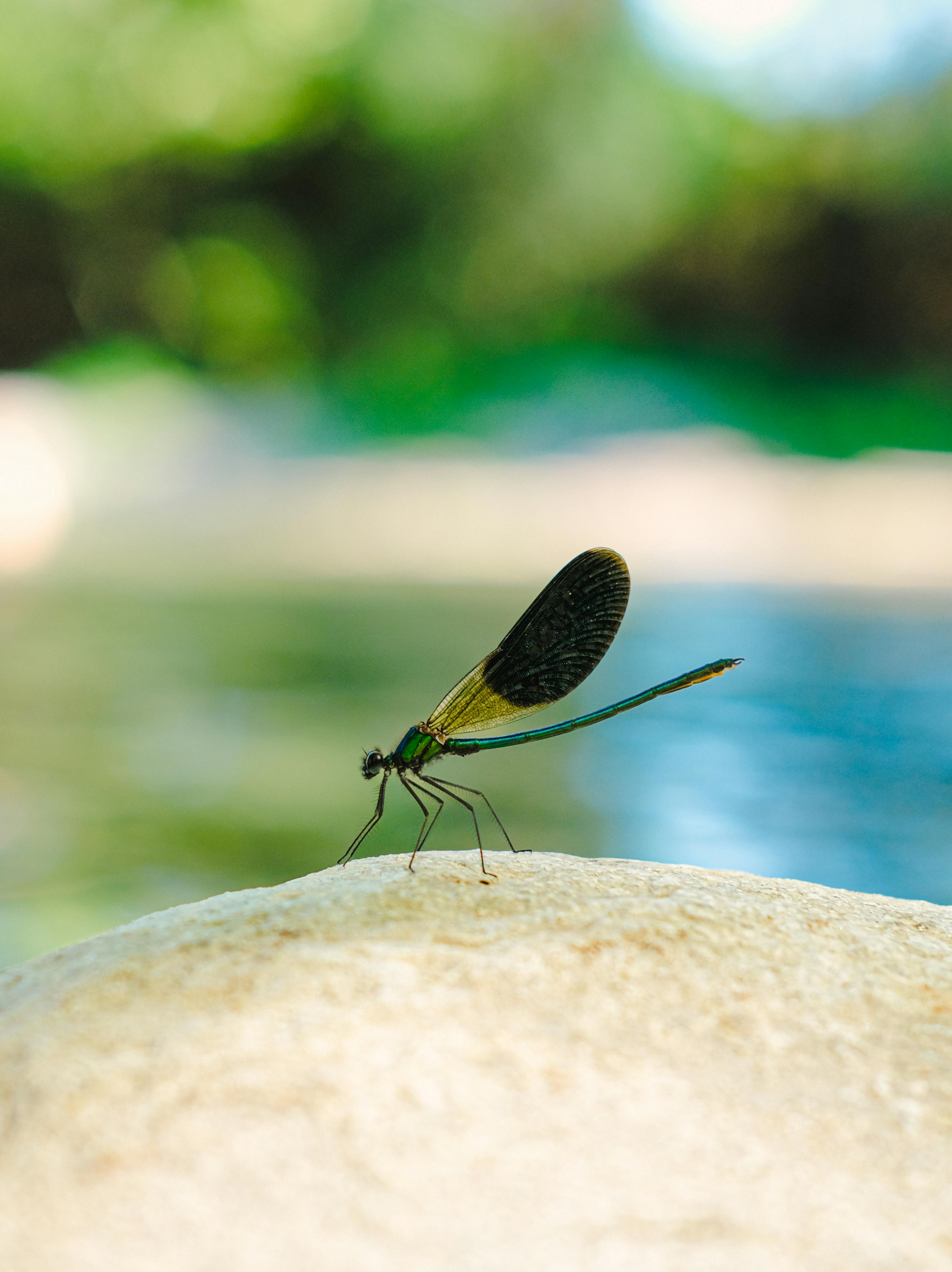 Close-up macro image of a dragonfly resting on a stone near a lake in Aydın, Türkiye.