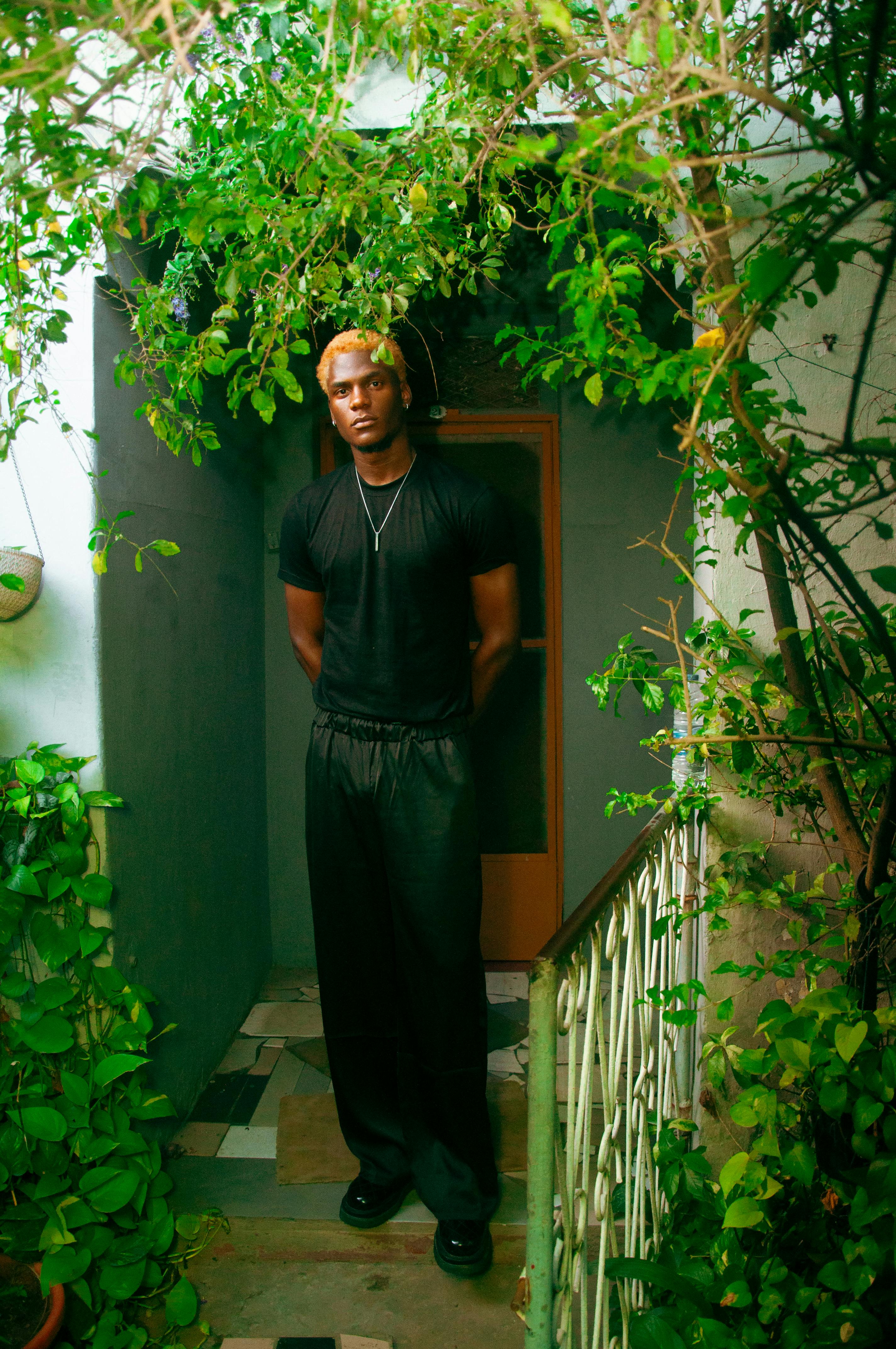 A man stands amid greenery in an entranceway, surrounded by plants.
