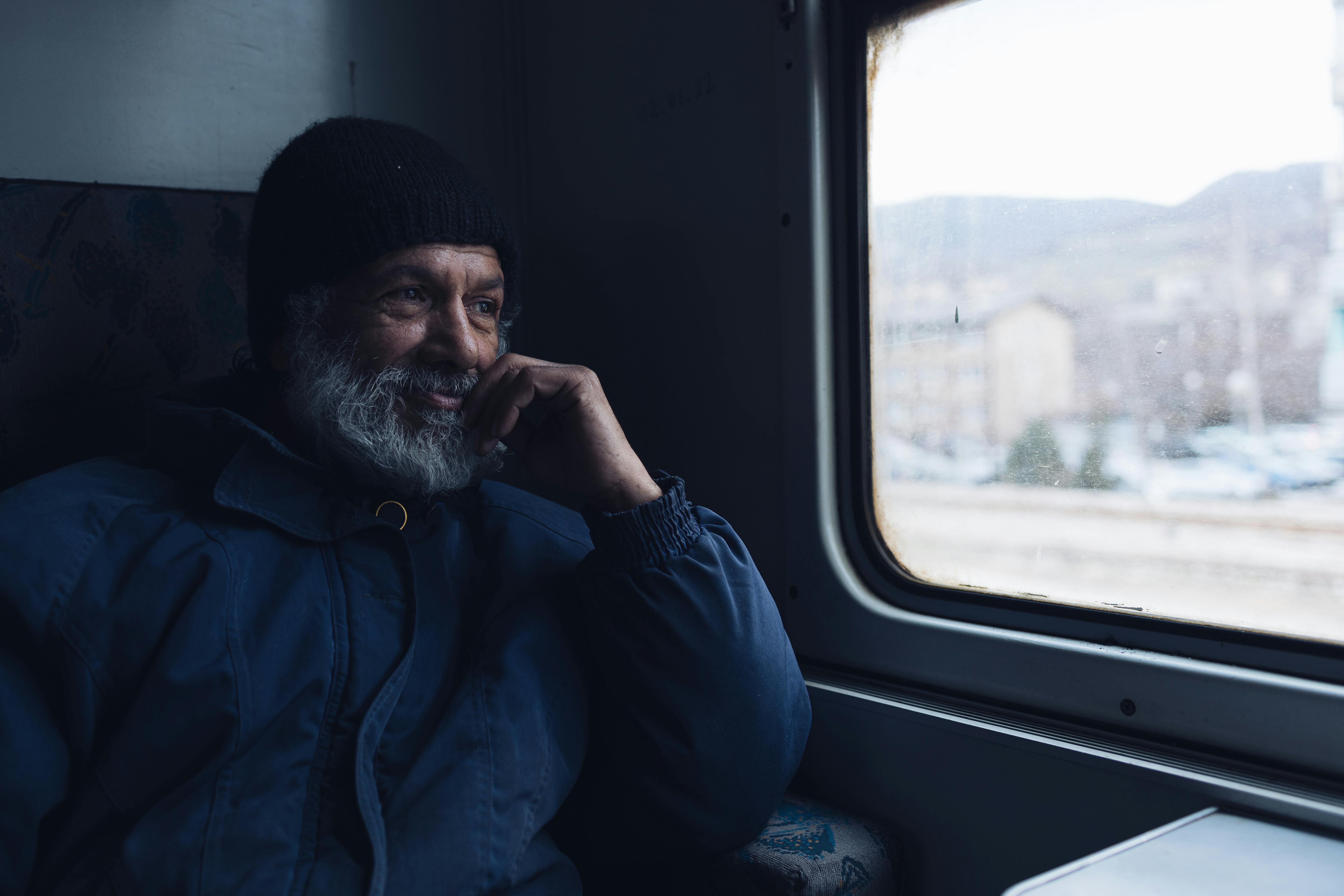A man in a warm jacket and beanie sits in a train, gazing thoughtfully out the window.
