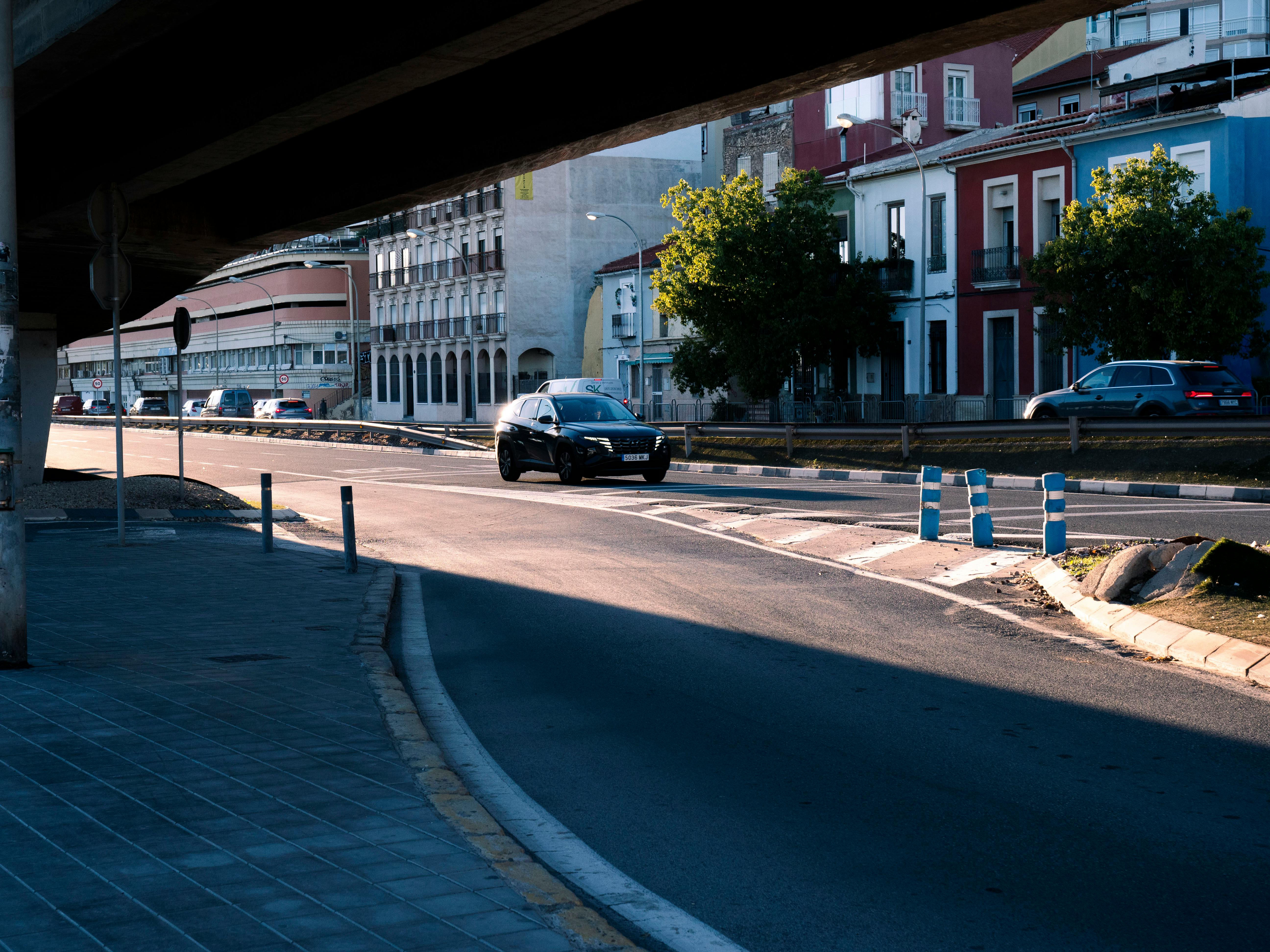 A lively urban street with cars passing under an elevated road. Featuring colorful architecture.