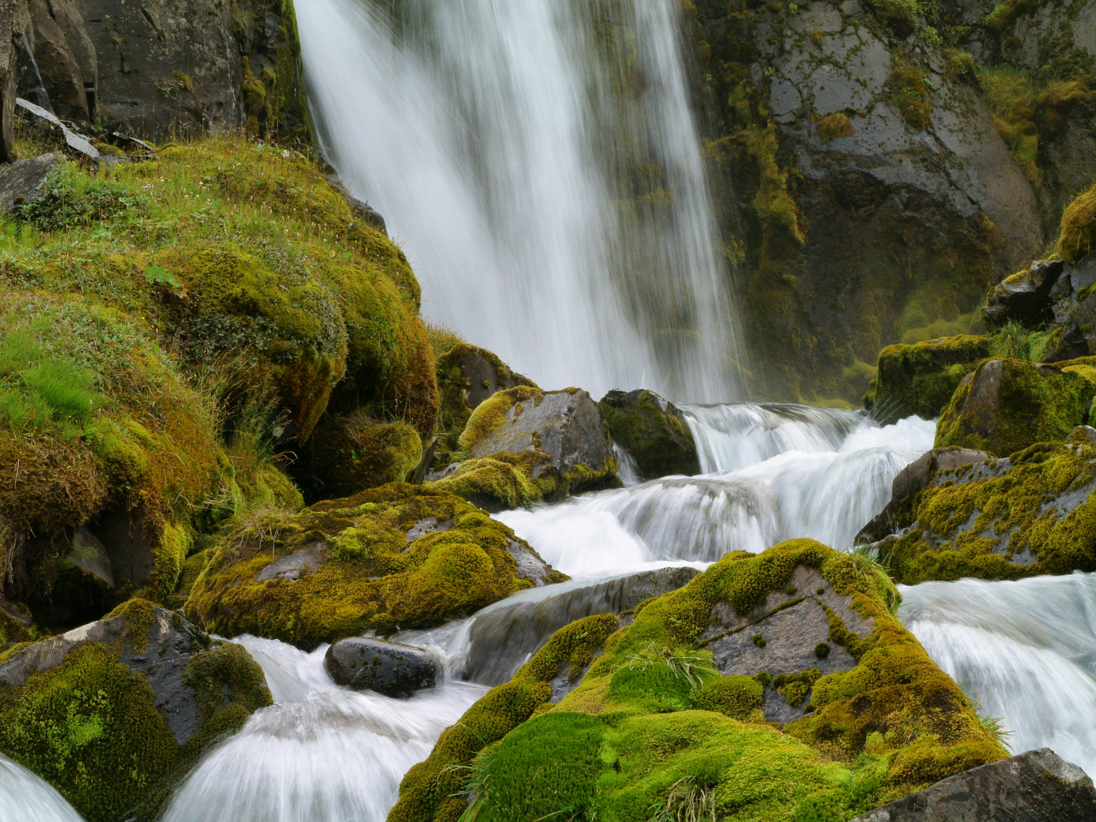 Tranquil waterfall cascading over moss-covered rocks. Ideal for relaxation and nature themes.
