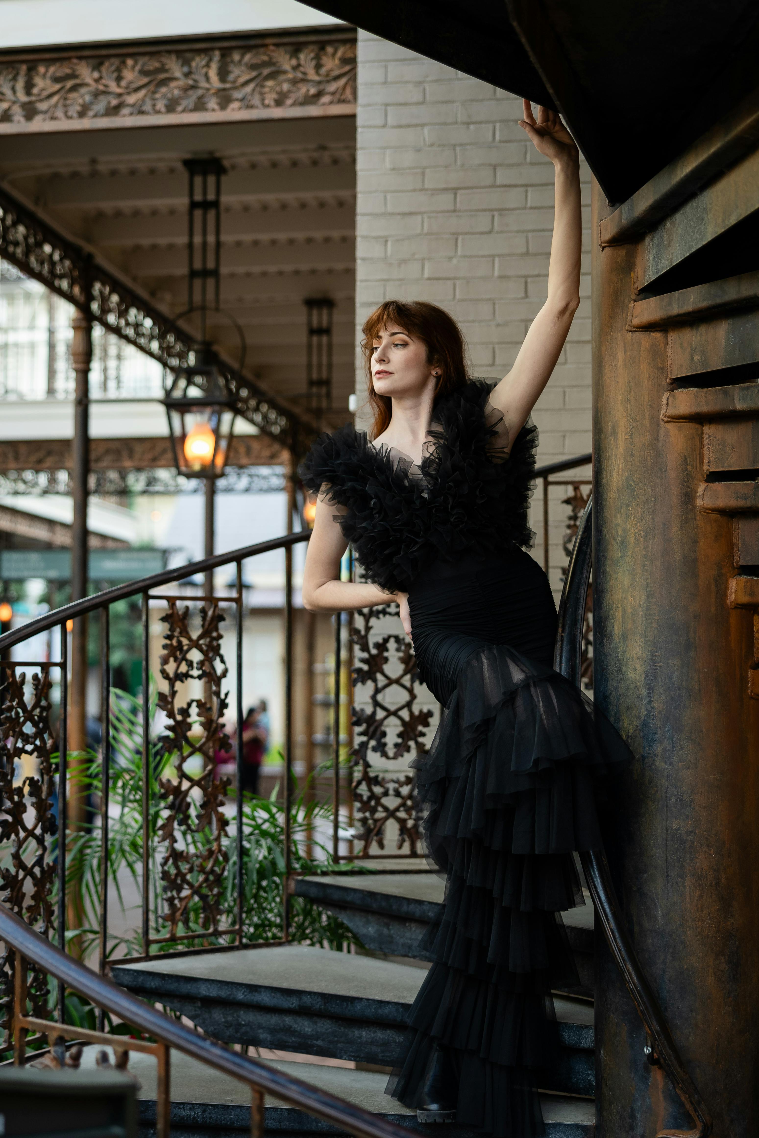 Woman in a black gown poses gracefully against a decorative staircase, showcasing elegance and style.