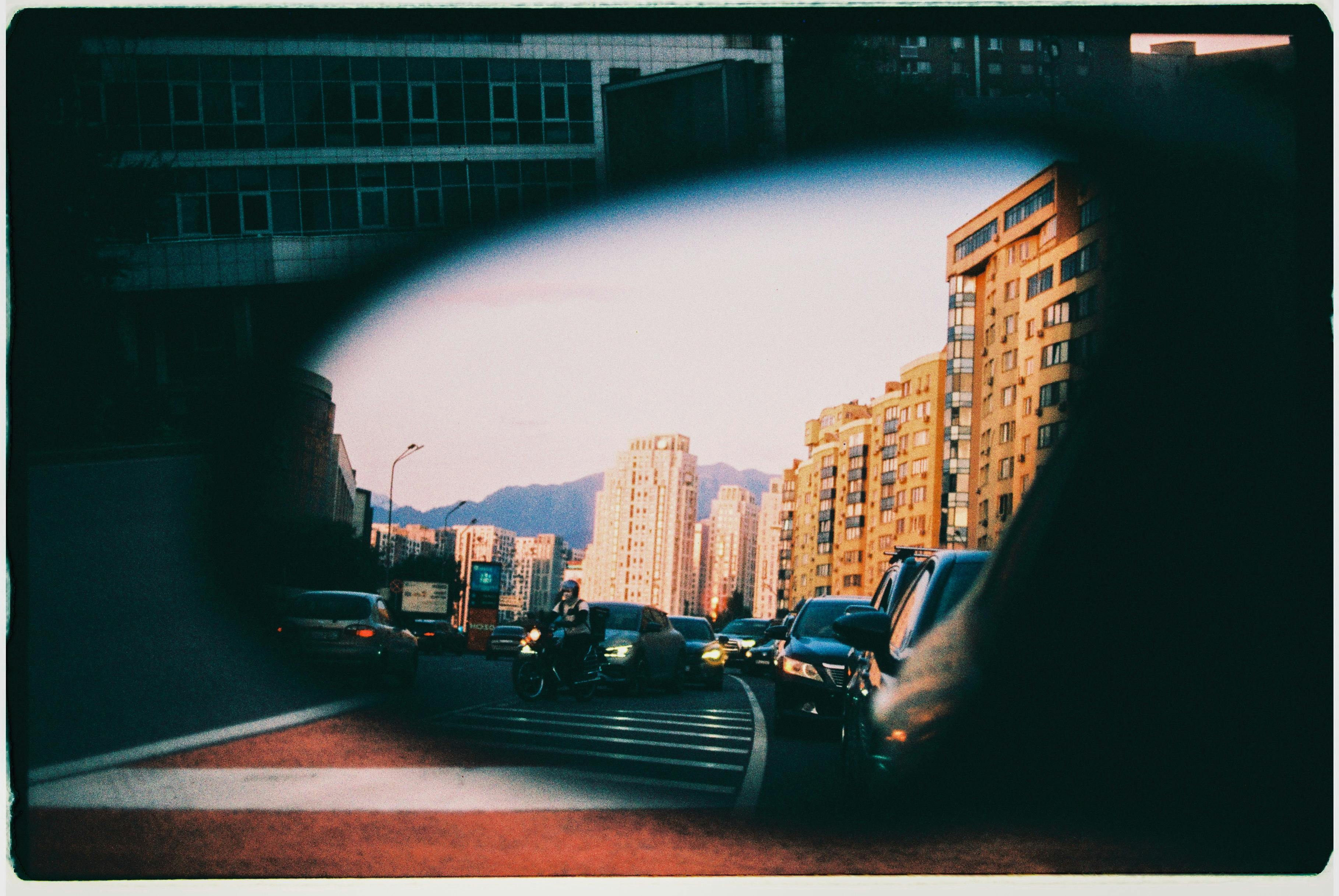 Urban reflection in car mirror with city buildings and mountains at sunset in Almaty.