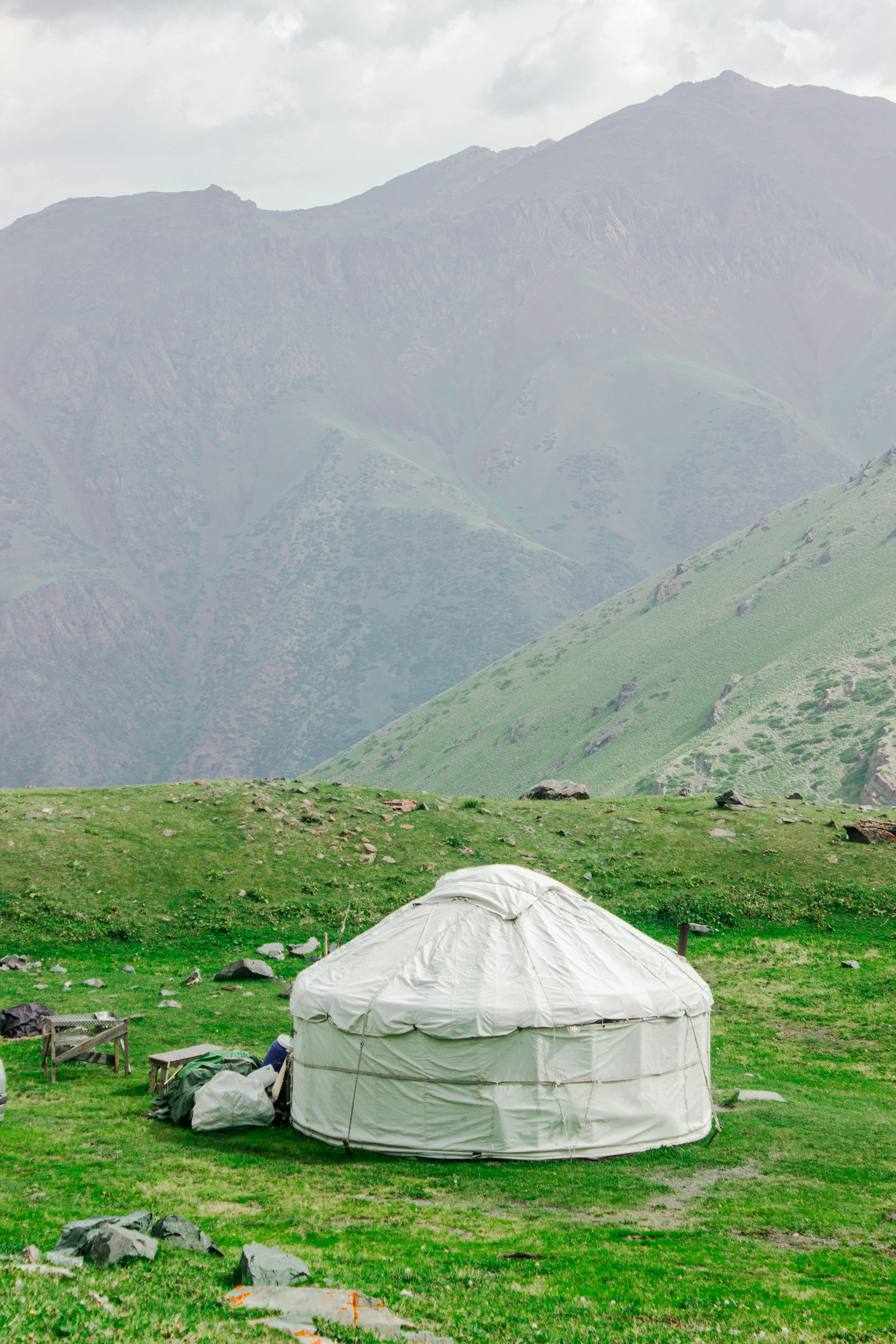 A serene image of a traditional yurt set against the majestic mountains of Kyrgyzstan, showcasing cultural heritage.