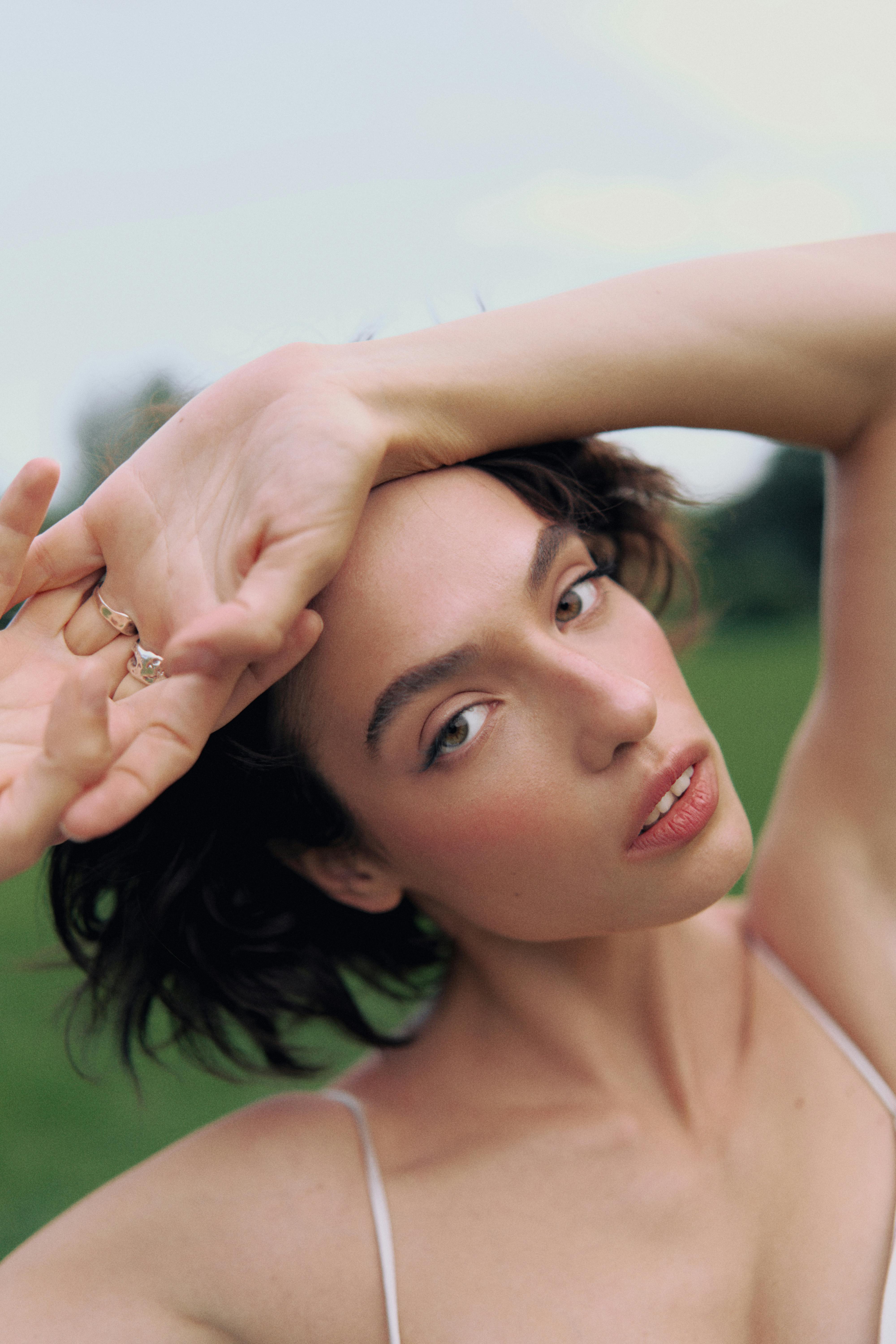 A striking fashion portrait of a woman outdoors, capturing elegance and grace.