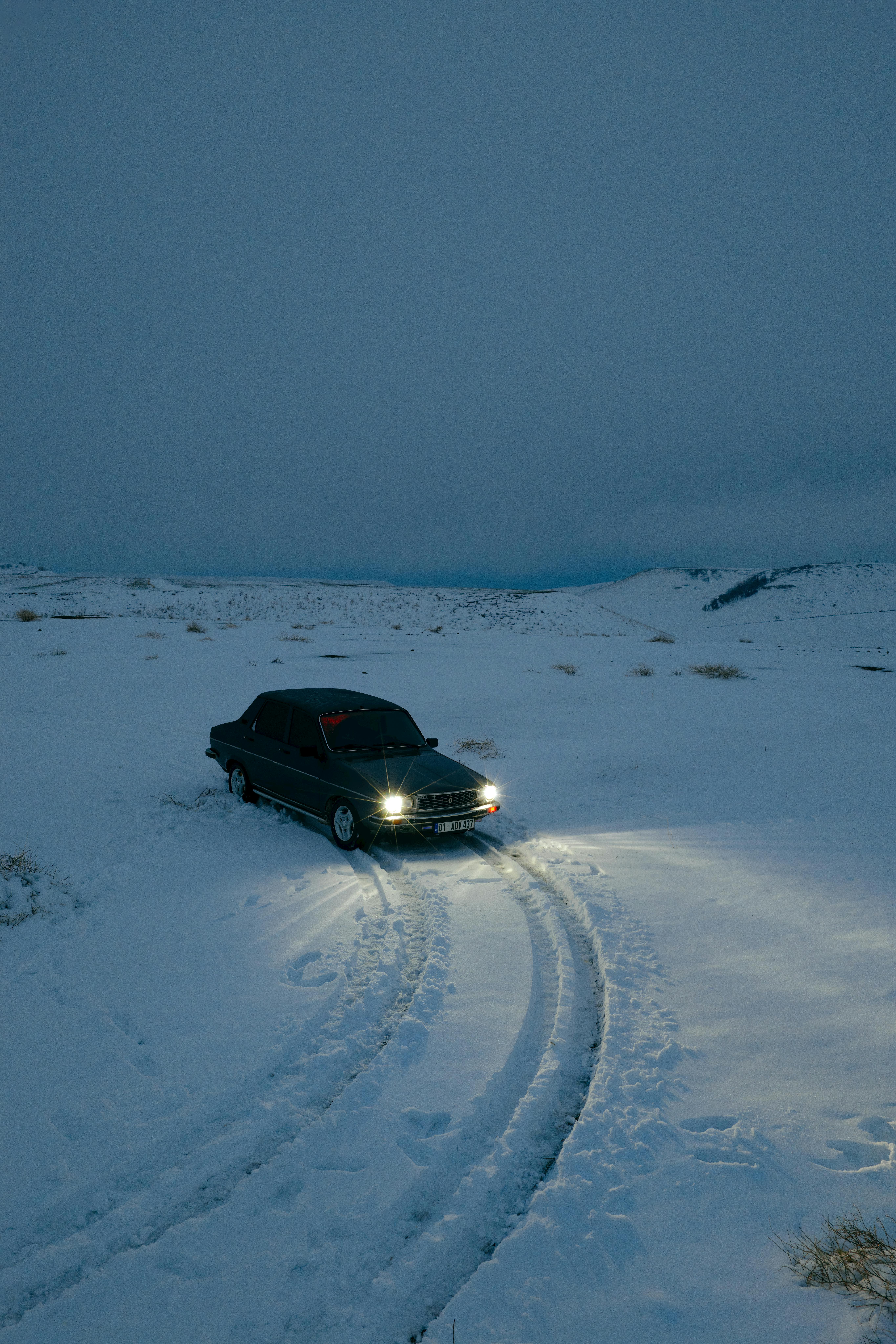 A lone car with headlights on navigates through snow-covered terrain under a twilight sky in Adıyaman, Türkiye.