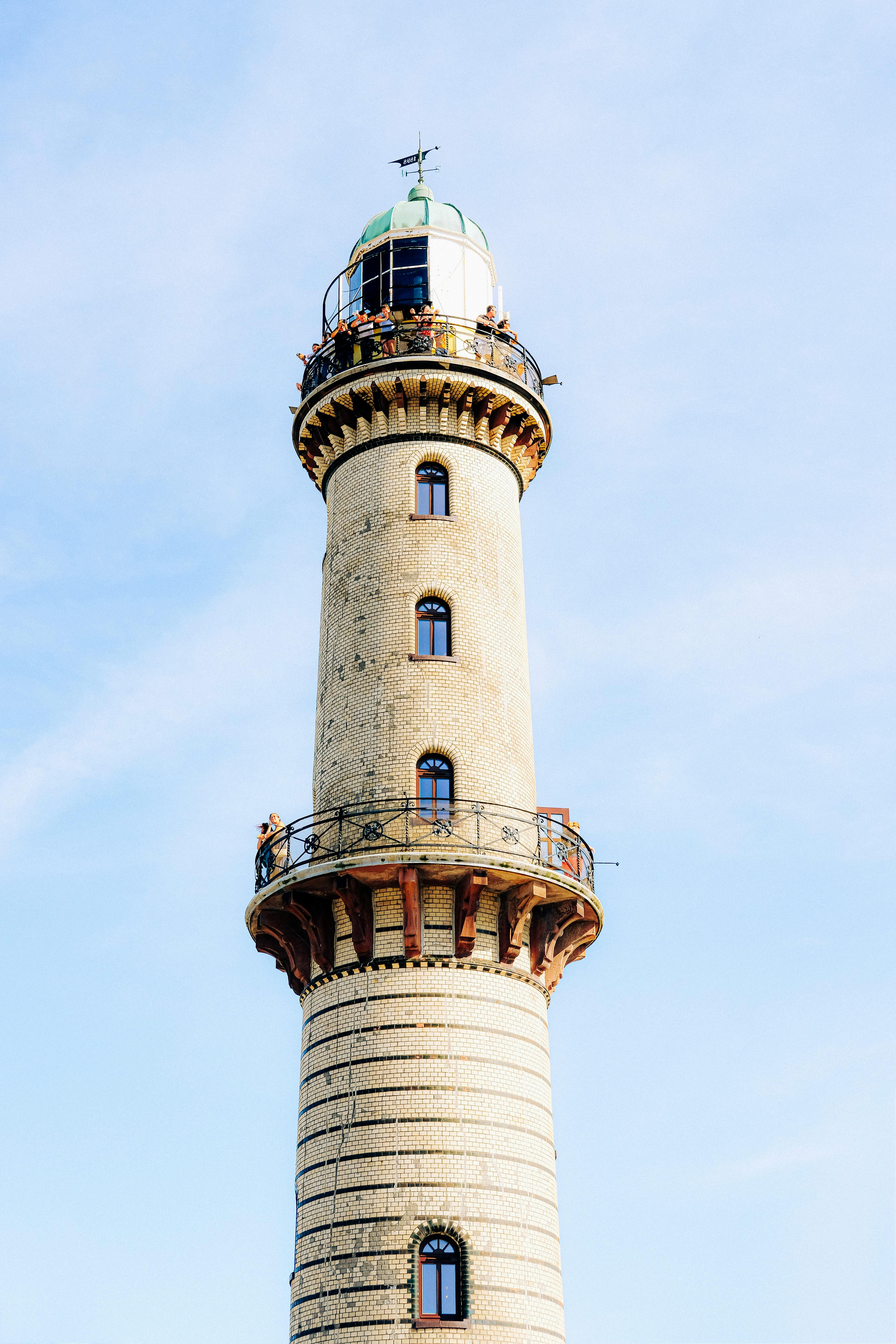 Close-up of a historic lighthouse tower with clear blue sky background, capturing architectural details.