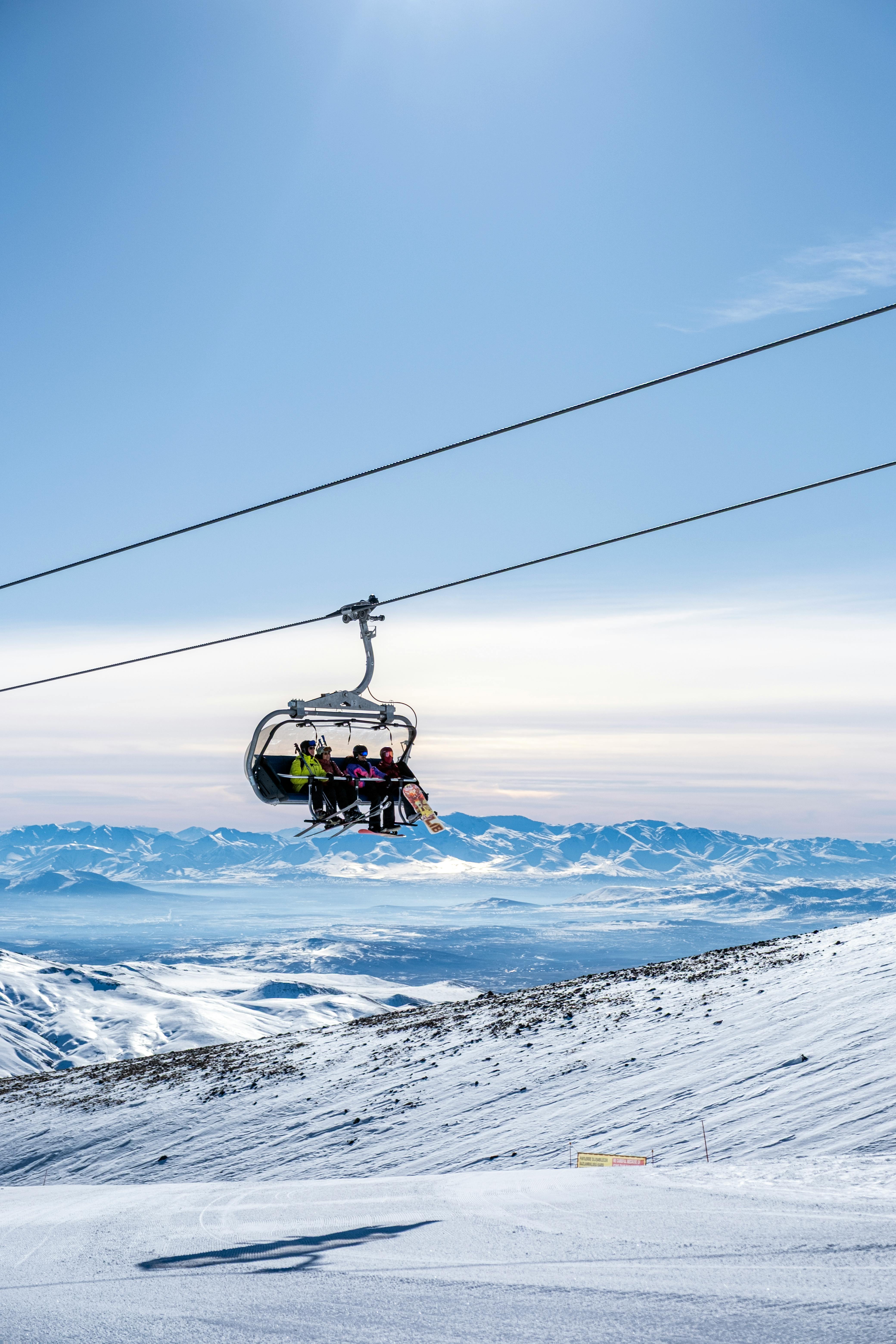 A ski lift carrying skiers over snowy mountains under a bright blue sky.