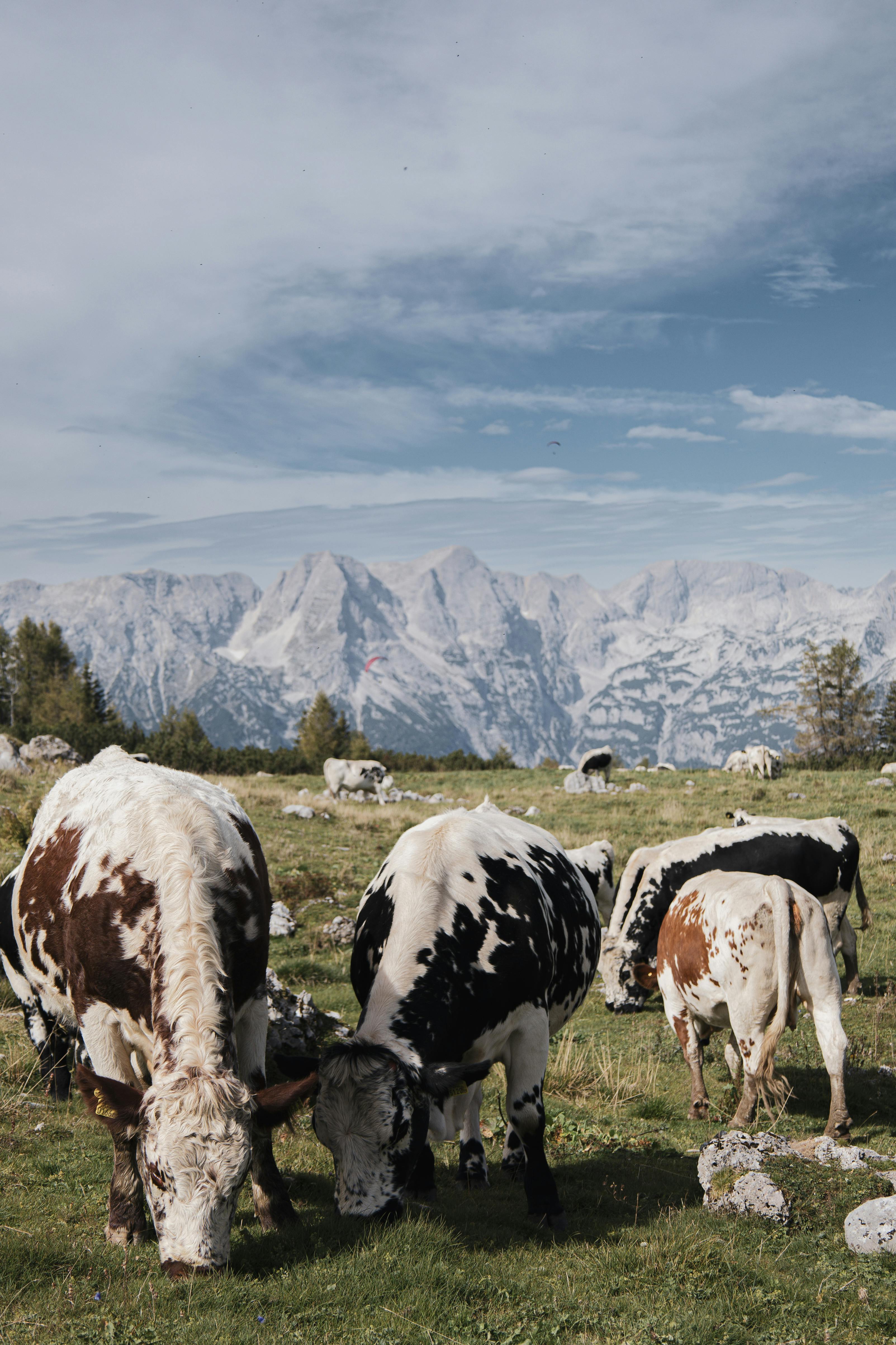 Cows grazing with stunning mountain backdrop in Hinterstoder, Austria.