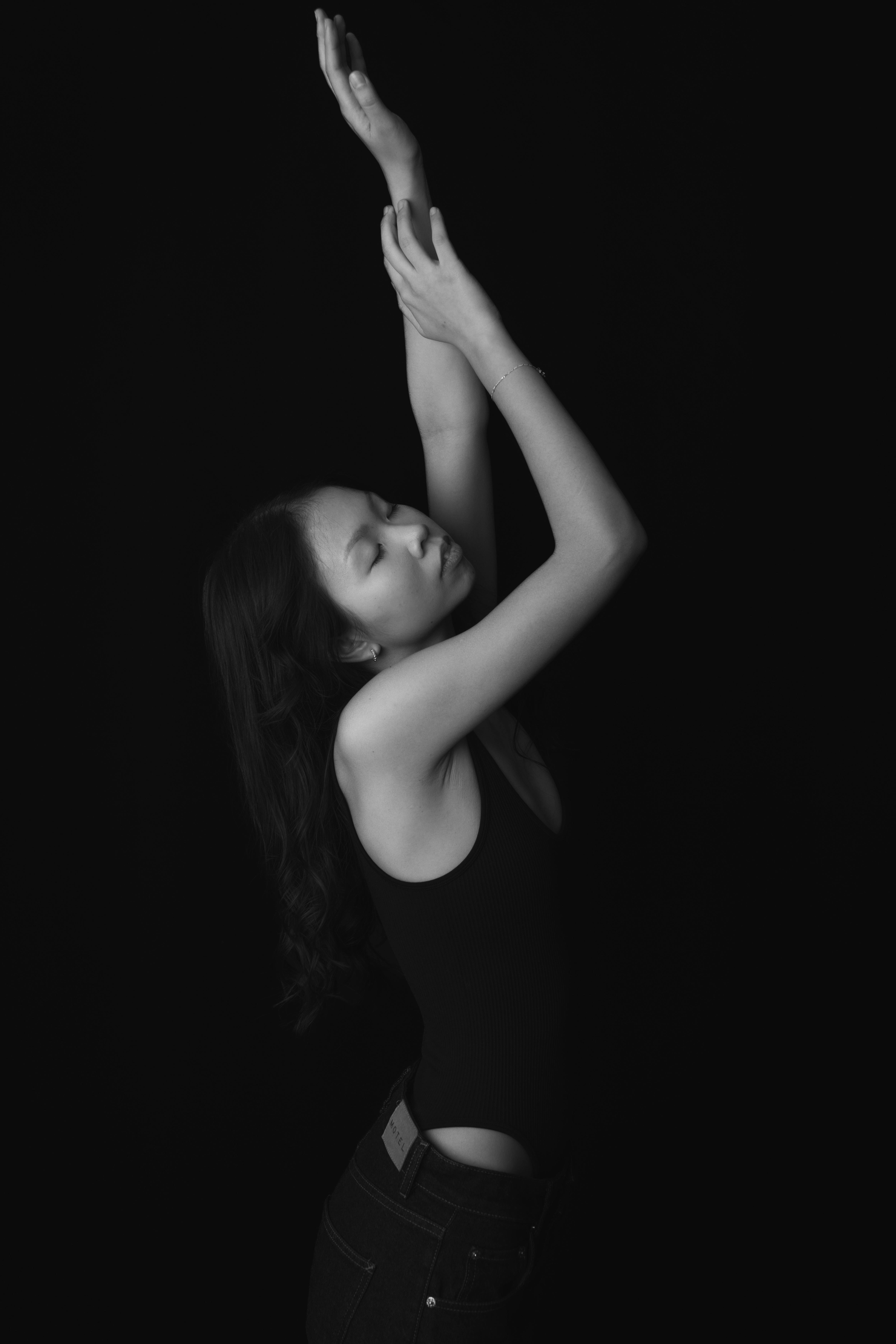 Artistic black and white portrait of a woman in a graceful dance pose.