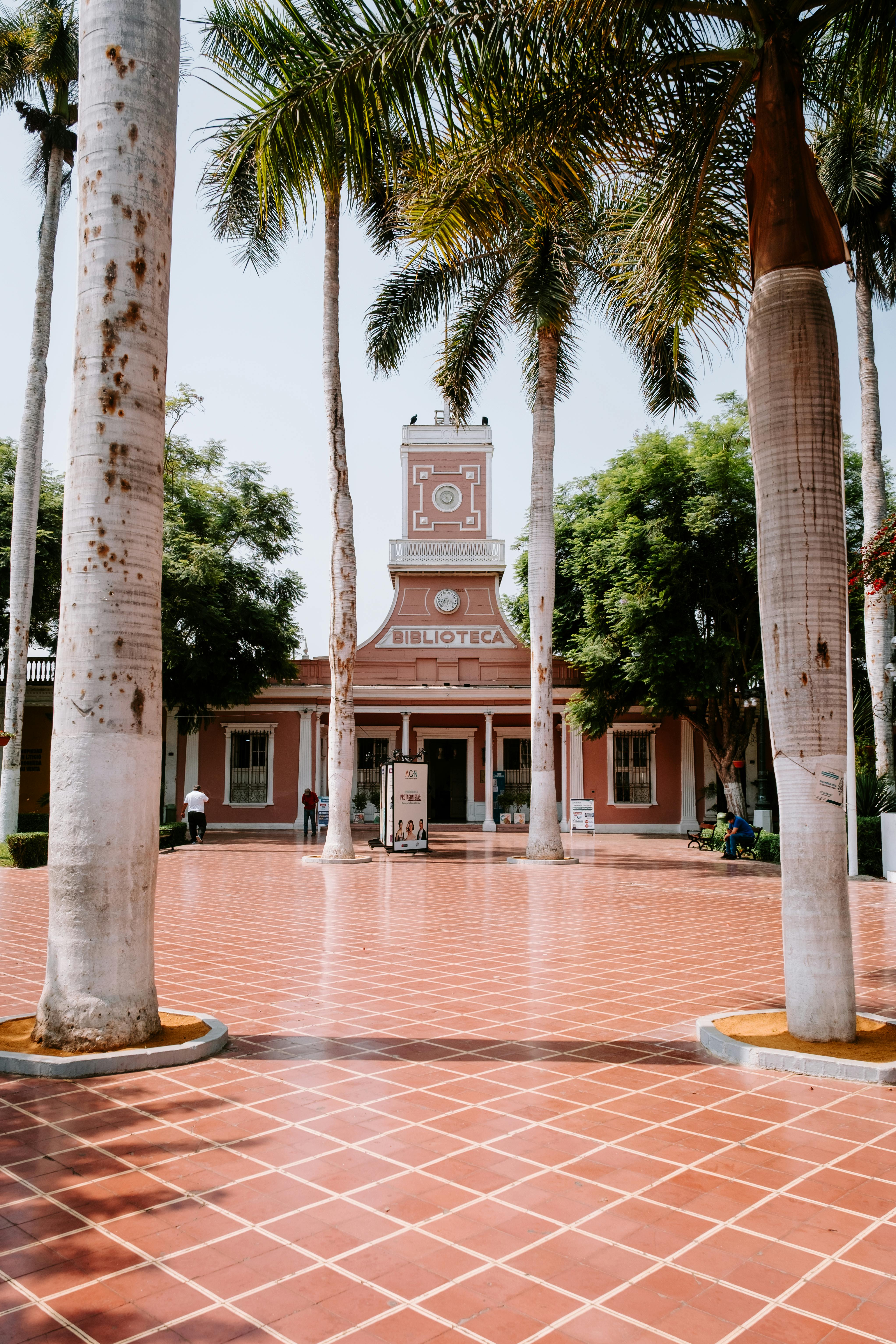 Explore the vibrant entrance of a library in Callao Region, surrounded by palm trees and red tiles.