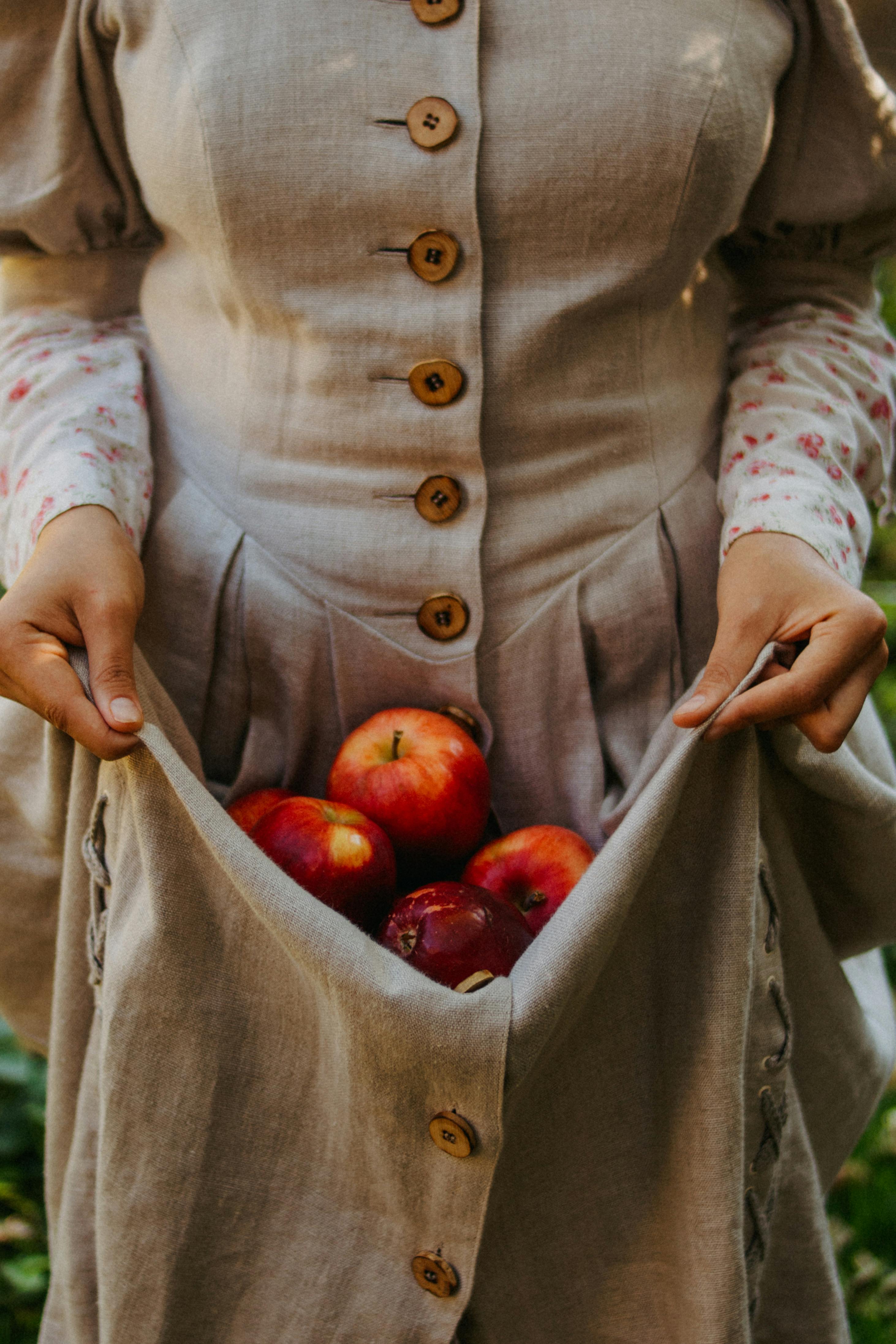 Close-up of a woman collecting red apples in her linen dress outdoors.