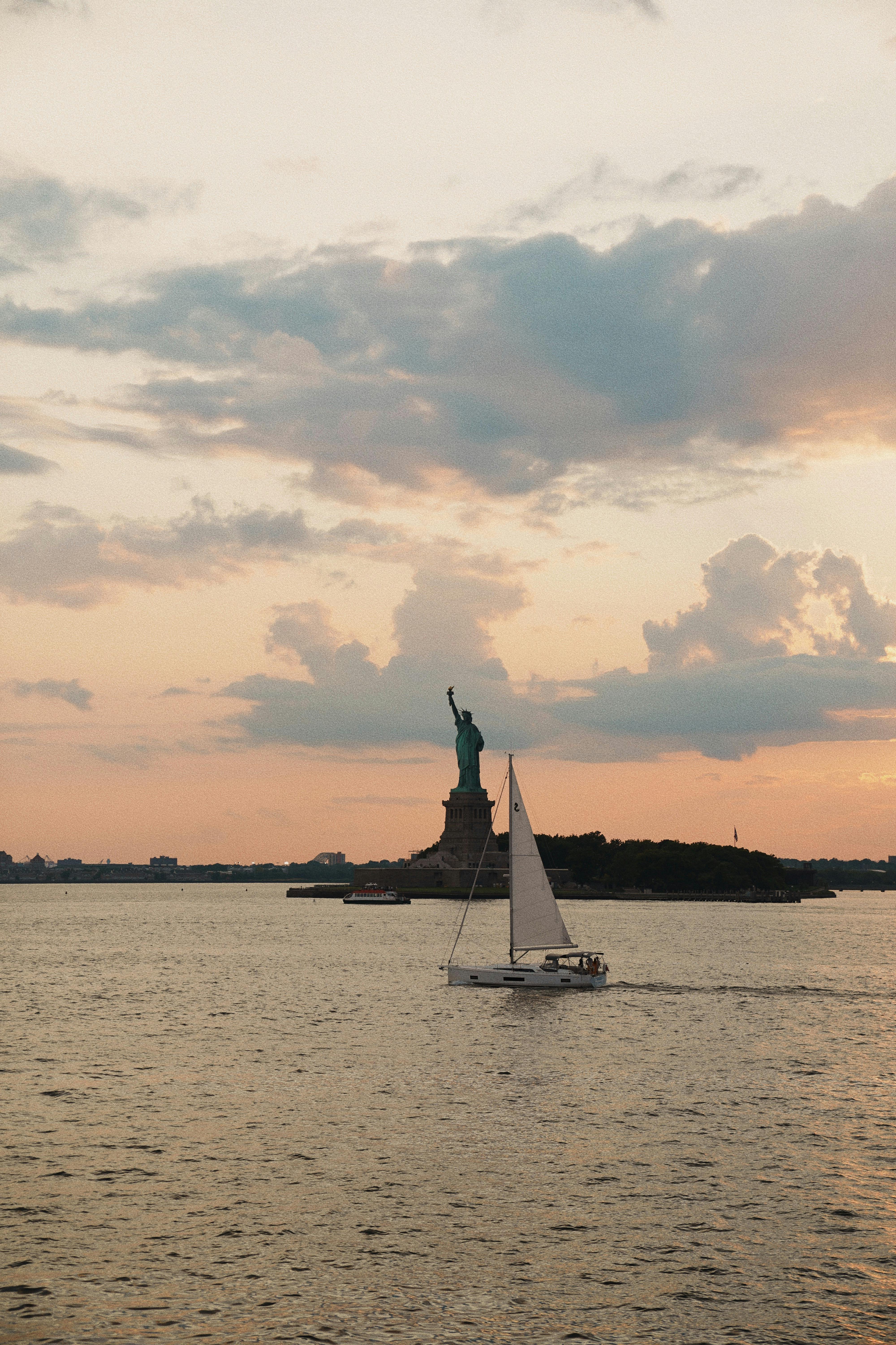 A sailboat glides by the iconic Statue of Liberty during a picturesque sunset over New York Harbor.