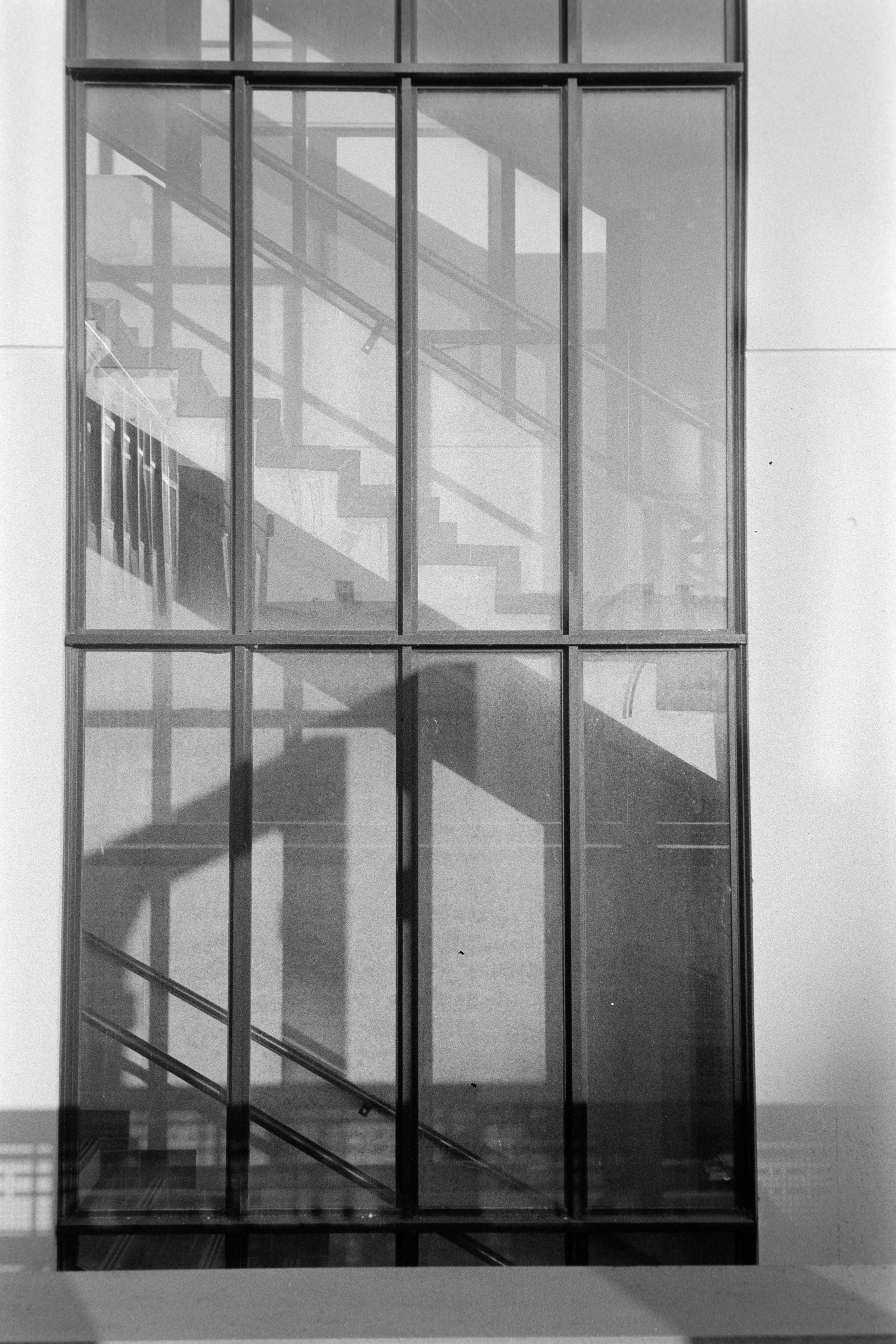 Black and white image capturing staircase reflections through glass, creating a pattern.