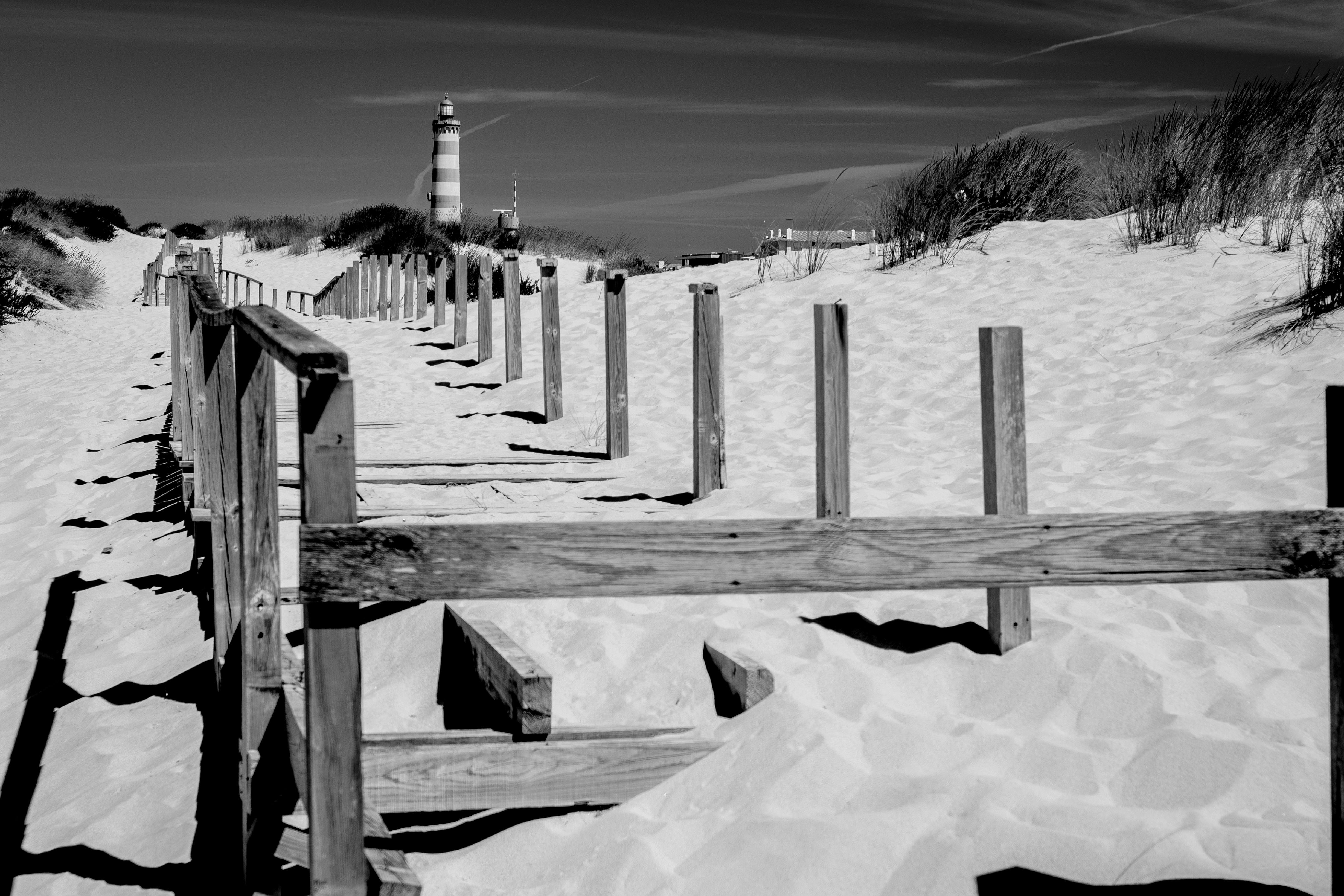A striking black and white image featuring a sandy beach path leading to a distant lighthouse.