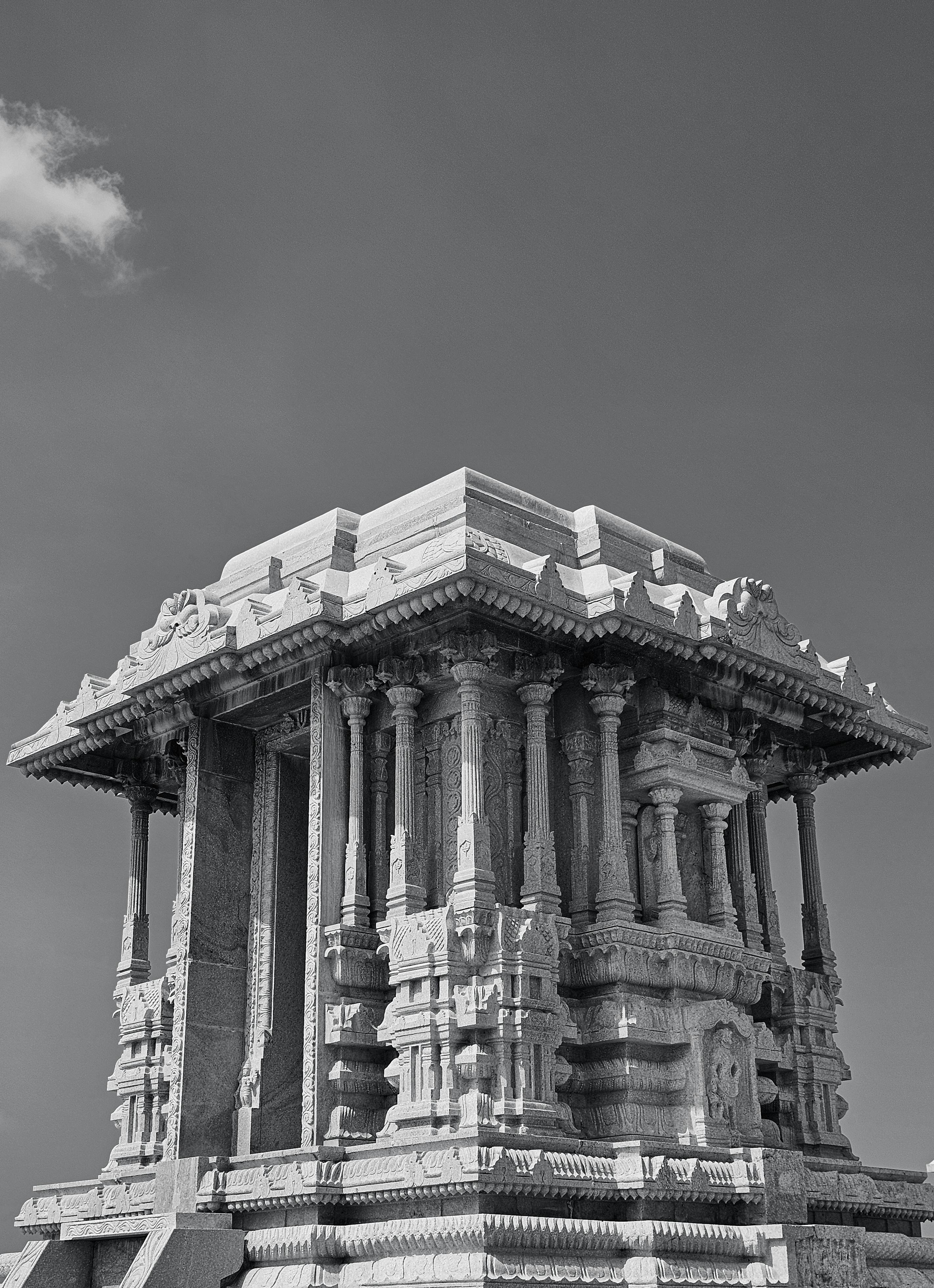 Capture of a historic Hoysala temple showcasing intricate stone carvings and architecture in black and white.