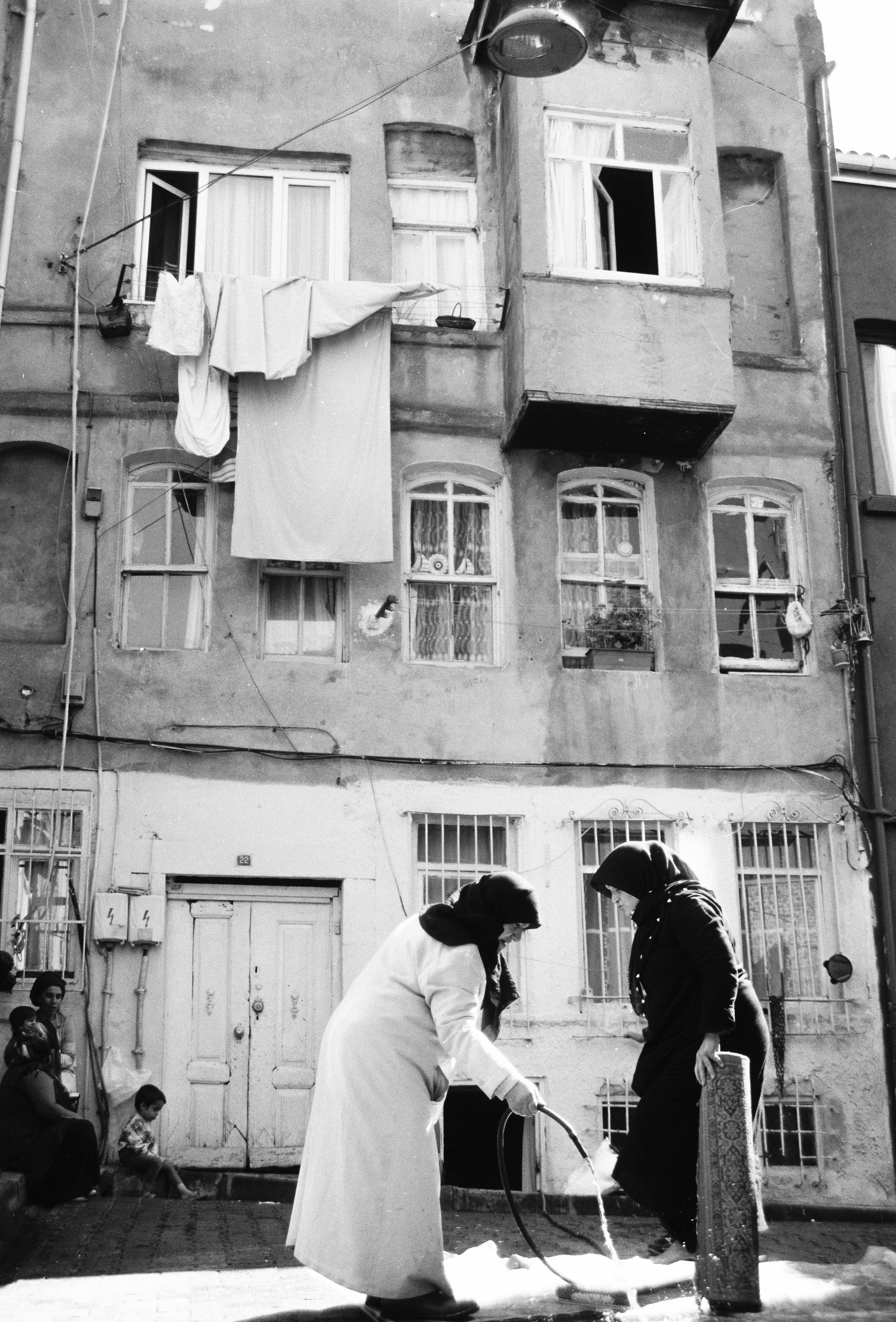 A candid black and white street scene in İstanbul, showcasing cultural life and historic architecture.