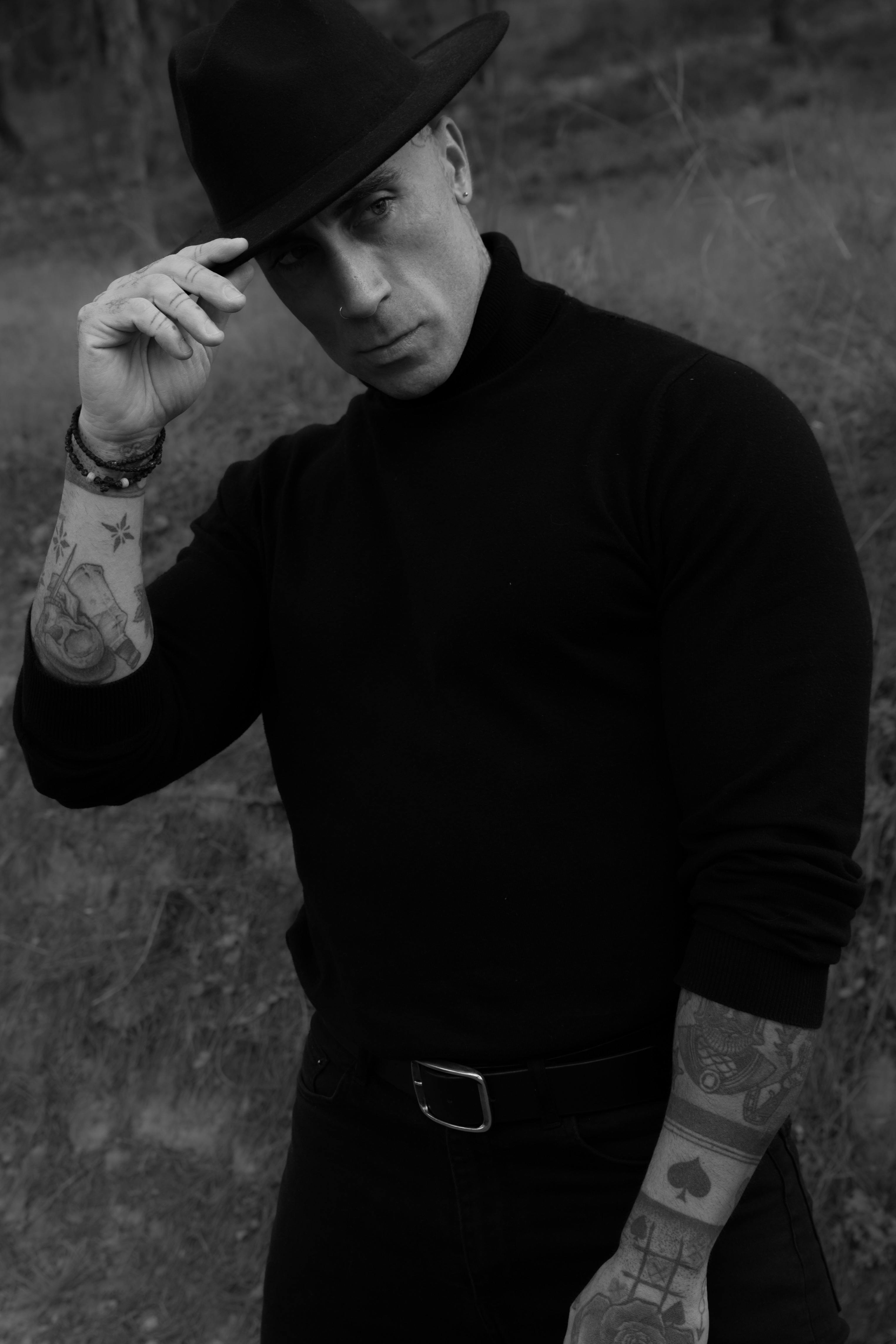 Black and white portrait of a tattooed man posing confidently in a black hat outdoors.
