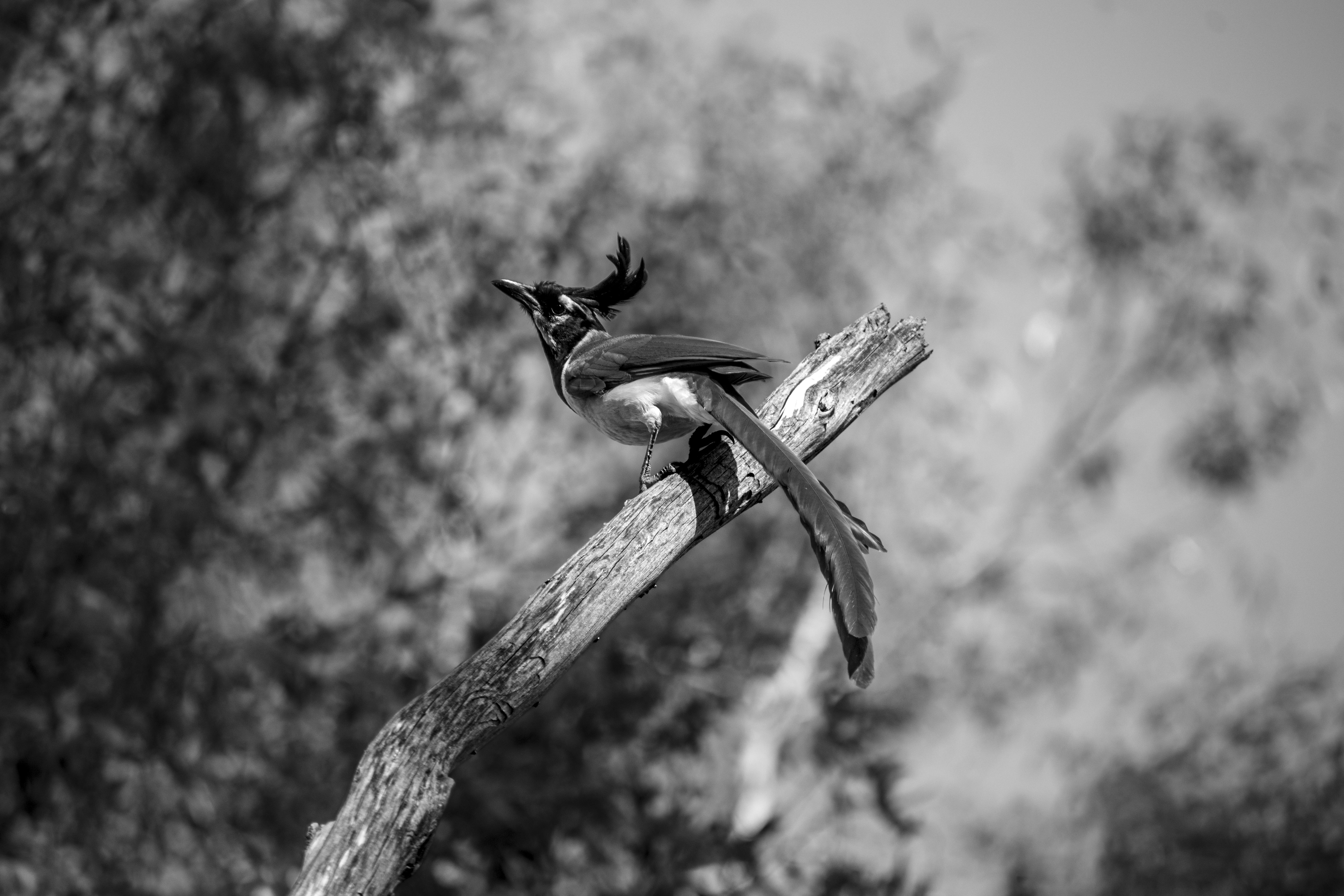 Black and white photo of a bird resting on a branch in nature, showcasing its striking plumage.